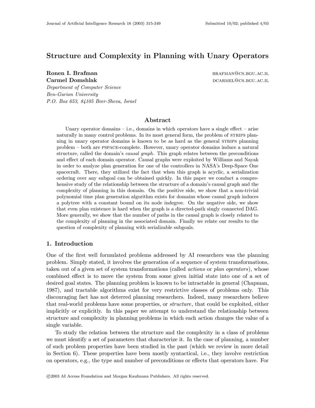 Unary operator domains -- i.e., domains in which operators have a single effect -- arise naturally in many control problems. In its most general form, the problem of STRIPS planning in unary operator domains is known to be as hard as the general STRIPS planning problem -- both are PSPACE-complete. However, unary operator domains induce a natural structure, called the domain's causal graph. This graph relates between the preconditions and effect of each domain operator. Causal graphs were exploited by Williams and Nayak in order to analyze plan generation for one of the controllers in NASA's Deep-Space One spacecraft. There, they utilized the fact that when this graph is acyclic, a serialization ordering over any subgoal can be obtained quickly. In this paper we conduct a comprehensive study of the relationship between the structure of a domain's causal graph and the complexity of planning in this domain. On the positive side, we show that a non-trivial polynomial time plan generation algorithm exists for domains whose causal graph induces a polytree with a constant bound on its node indegree. On the negative side, we show that even plan existence is hard when the graph is a directed-path singly connected DAG. More generally, we show that the number of paths in the causal graph is closely related to the complexity of planning in the associated domain. Finally we relate our results to the question of complexity of planning with serializable subgoals.