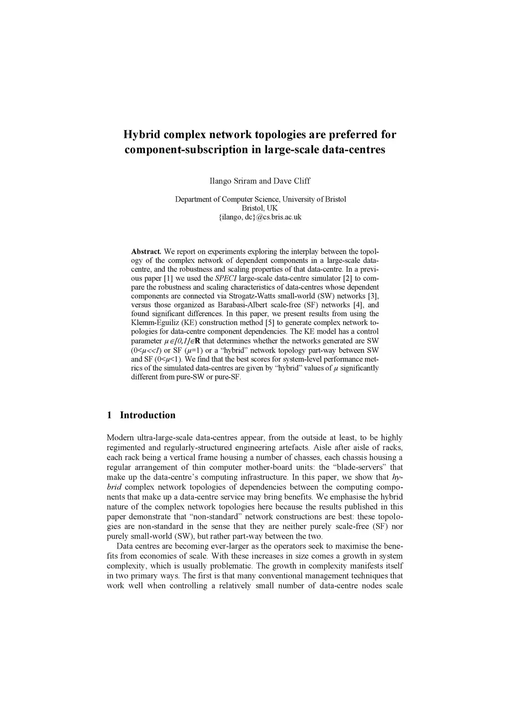 We report on experiments exploring the interplay between the topology of the complex network of dependent components in a large-scale data-centre, and the robustness and scaling properties of that data-centre. In a previous paper [1] we used the SPECI large-scale data-centre simulator [2] to compare the robustness and scaling characteristics of data-centres whose dependent components are connected via Strogatz-Watts small-world (SW) networks [3], versus those organized as Barabasi-Albert scale-free (SF) networks [4], and found significant differences. In this paper, we present results from using the Klemm-Eguiliz (KE) construction method [5] to generate complex network topologies for data-centre component dependencies. The KE model has a control parameter {\mu}\in[0,1]\inR that determines whether the networks generated are SW (0<{\mu}<<1) or SF ({\mu}=1) or a "hybrid" network topology part-way between SW and SF (0<{\mu}<1). We find that the best scores for system-level performance metrics of the simulated data-centres are given by "hybrid" values of {\mu} significantly different from pure-SW or pure-SF.
