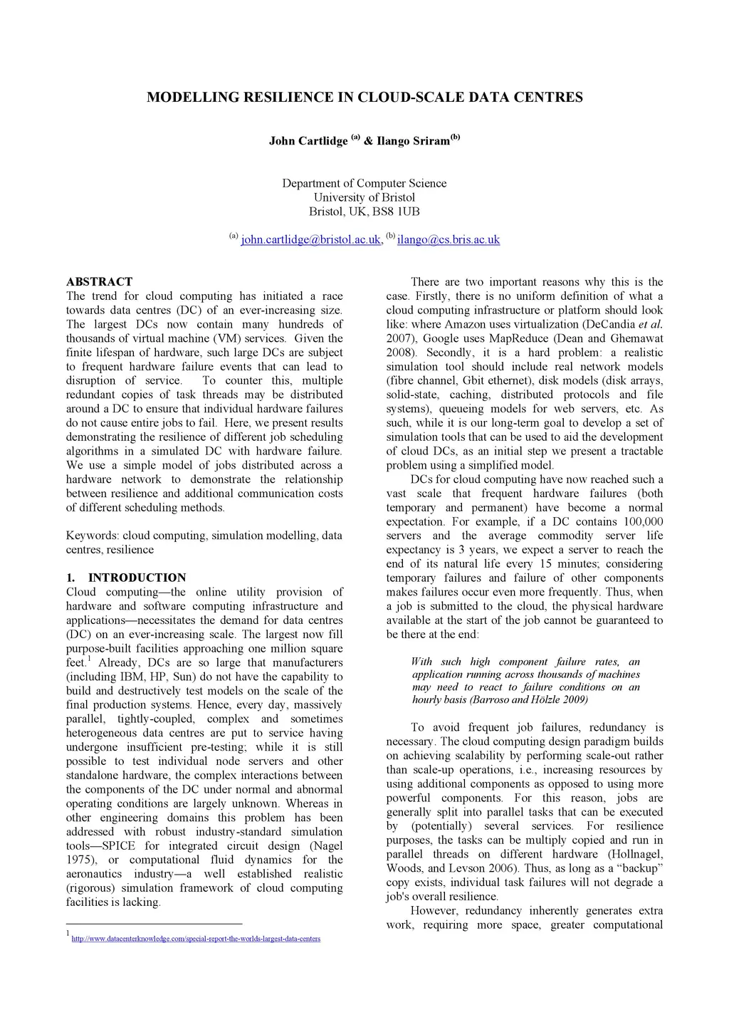 The trend for cloud computing has initiated a race towards data centres (DC) of an ever-increasing size. The largest DCs now contain many hundreds of thousands of virtual machine (VM) services. Given the finite lifespan of hardware, such large DCs are subject to frequent hardware failure events that can lead to disruption of service. To counter this, multiple redundant copies of task threads may be distributed around a DC to ensure that individual hardware failures do not cause entire jobs to fail. Here, we present results demonstrating the resilience of different job scheduling algorithms in a simulated DC with hardware failure. We use a simple model of jobs distributed across a hardware network to demonstrate the relationship between resilience and additional communication costs of different scheduling methods.