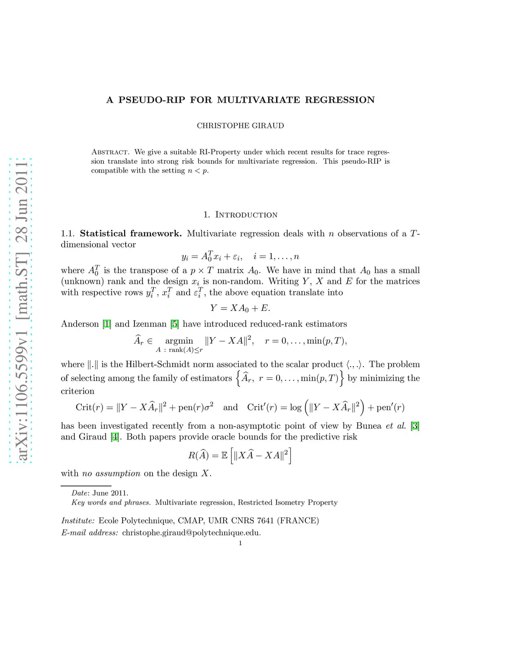 We give a suitable RI-Property under which recent results for trace regression translate into strong risk bounds for multivariate regression. This pseudo-RIP is compatible with the setting .
