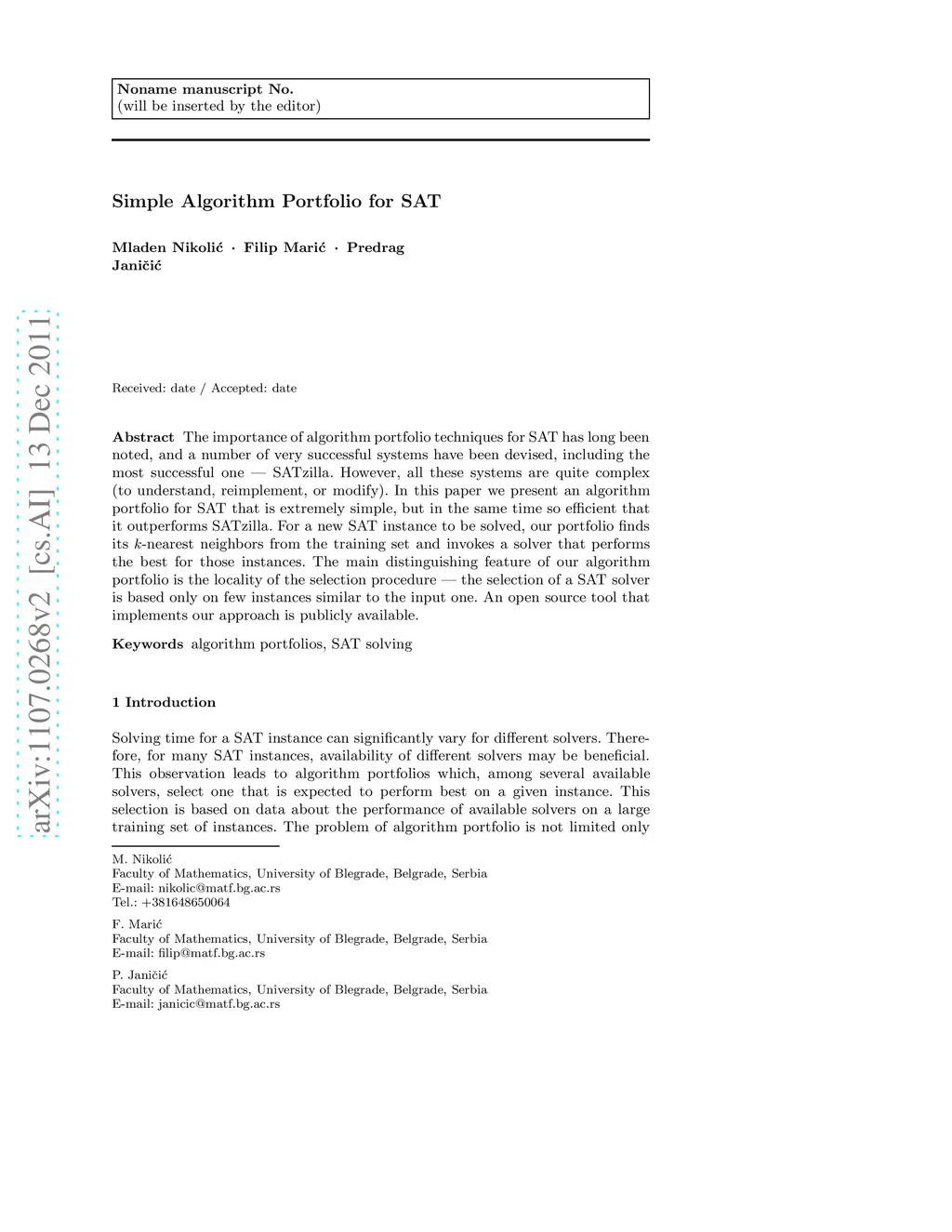 Simple Algorithm Portfolio for SAT