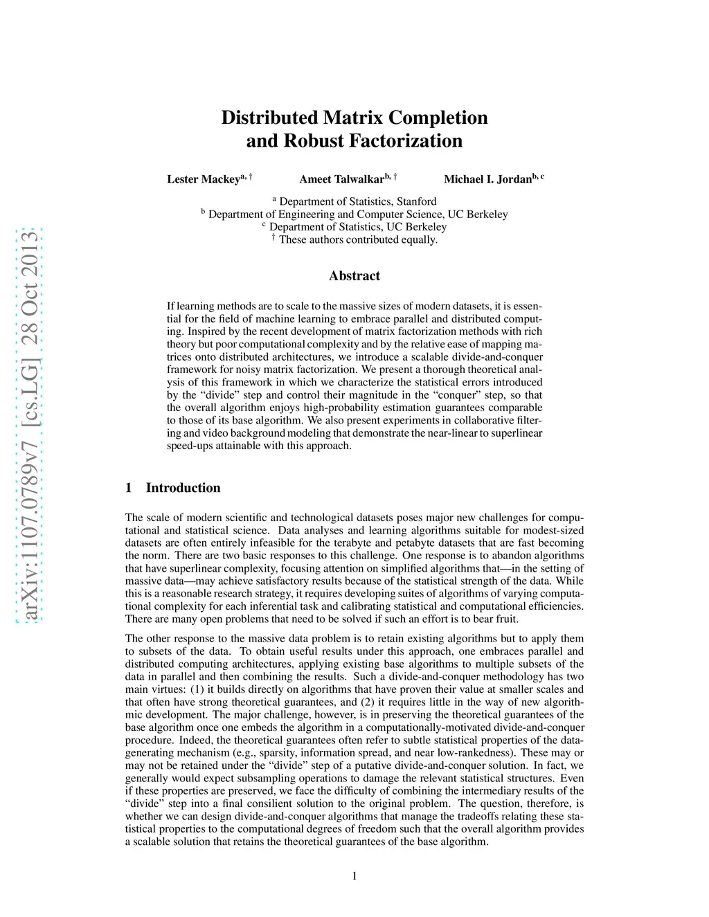 If learning methods are to scale to the massive sizes of modern datasets, it is essential for the field of machine learning to embrace parallel and distributed computing. Inspired by the recent development of matrix factorization methods with rich theory but poor computational complexity and by the relative ease of mapping matrices onto distributed architectures, we introduce a scalable divide-and-conquer framework for noisy matrix factorization. We present a thorough theoretical analysis of this framework in which we characterize the statistical errors introduced by the "divide" step and control their magnitude in the "conquer" step, so that the overall algorithm enjoys high-probability estimation guarantees comparable to those of its base algorithm. We also present experiments in collaborative filtering and video background modeling that demonstrate the near-linear to superlinear speed-ups attainable with this approach.