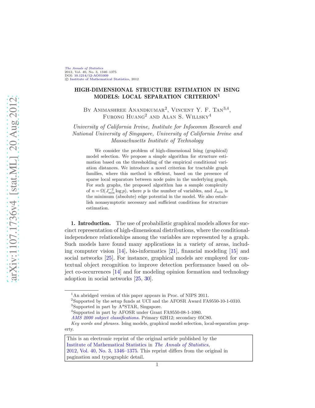 We consider the problem of high-dimensional Ising (graphical) model selection. We propose a simple algorithm for structure estimation based on the thresholding of the empirical conditional variation distances. We introduce a novel criterion for tractable graph families, where this method is efficient, based on the presence of sparse local separators between node pairs in the underlying graph. For such graphs, the proposed algorithm has a sample complexity of , where is the number of variables, and is the minimum (absolute) edge potential in the model. We also establish nonasymptotic necessary and sufficient conditions for structure estimation.