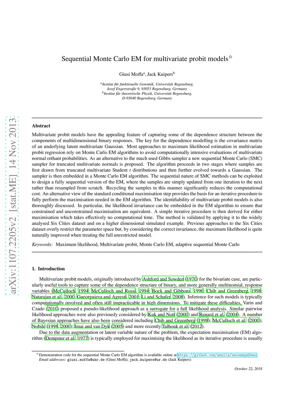 Multivariate probit models (MPM) have the appealing feature of capturing some of the dependence structure between the components of multidimensional binary responses. The key for the dependence modelling is the covariance matrix of an underlying latent multivariate Gaussian. Most approaches to MLE in multivariate probit regression rely on MCEM algorithms to avoid computationally intensive evaluations of multivariate normal orthant probabilities. As an alternative to the much used Gibbs sampler a new SMC sampler for truncated multivariate normals is proposed. The algorithm proceeds in two stages where samples are first drawn from truncated multivariate Student distributions and then further evolved towards a Gaussian. The sampler is then embedded in a MCEM algorithm. The sequential nature of SMC methods can be exploited to design a fully sequential version of the EM, where the samples are simply updated from one iteration to the next rather than resampled from scratch. Recycling the samples in this manner significantly reduces the computational cost. An alternative view of the standard conditional maximisation step provides the basis for an iterative procedure to fully perform the maximisation needed in the EM algorithm. The identifiability of MPM is also thoroughly discussed. In particular, the likelihood invariance can be embedded in the EM algorithm to ensure that constrained and unconstrained maximisation are equivalent. A simple iterative procedure is then derived for either maximisation which takes effectively no computational time. The method is validated by applying it to the widely analysed Six Cities dataset and on a higher dimensional simulated example. Previous approaches to the Six Cities overly restrict the parameter space but, by considering the correct invariance, the maximum likelihood is quite naturally improved when treating the full unrestricted model.