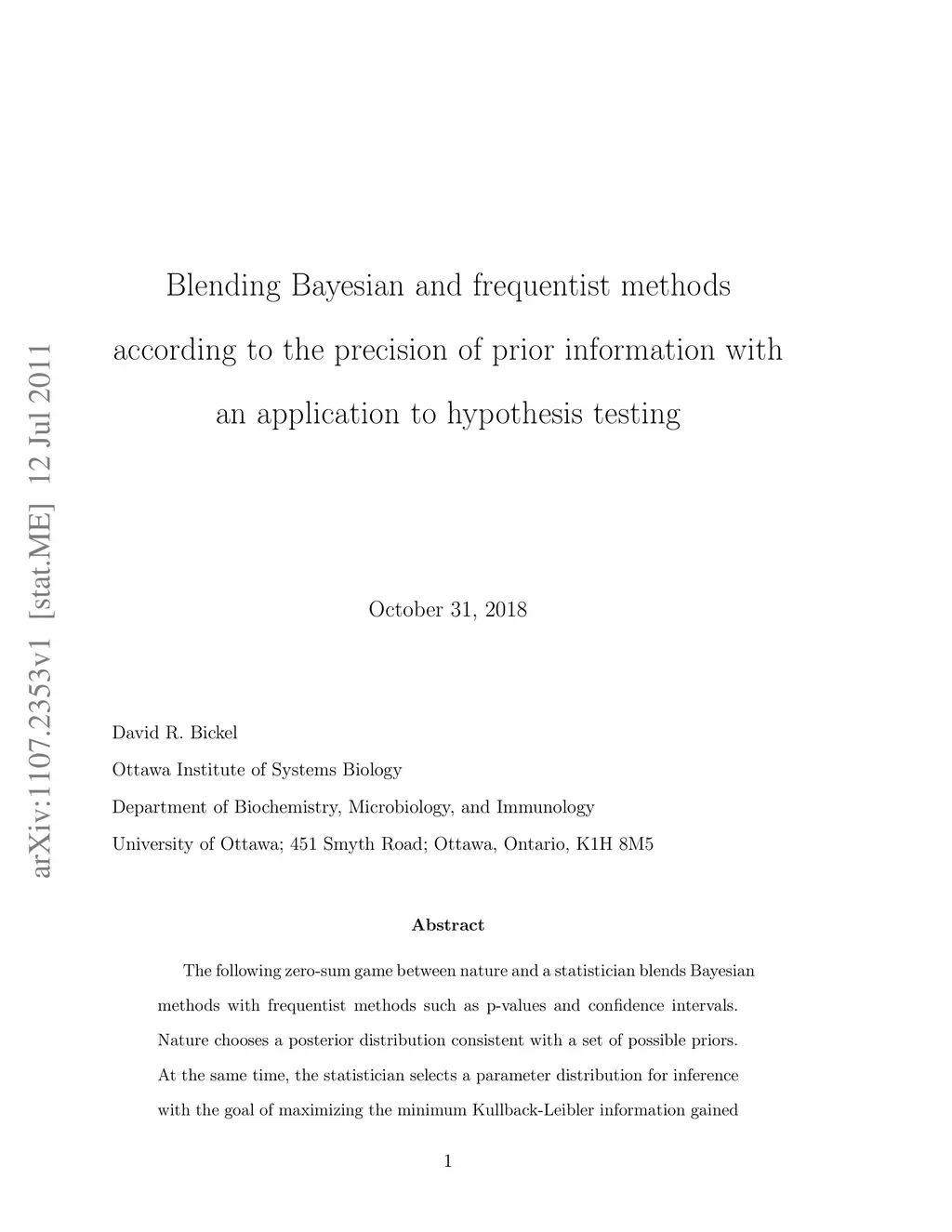The following zero-sum game between nature and a statistician blends Bayesian methods with frequentist methods such as p-values and confidence intervals. Nature chooses a posterior distribution consistent with a set of possible priors. At the same time, the statistician selects a parameter distribution for inference with the goal of maximizing the minimum Kullback-Leibler information gained over a confidence distribution or other benchmark distribution. An application to testing a simple null hypothesis leads the statistician to report a posterior probability of the hypothesis that is informed by both Bayesian and frequentist methodology, each weighted according how well the prior is known. Since neither the Bayesian approach nor the frequentist approach is entirely satisfactory in situations involving partial knowledge of the prior distribution, the proposed procedure reduces to a Bayesian method given complete knowledge of the prior, to a frequentist method given complete ignorance about the prior, and to a blend between the two methods given partial knowledge of the prior. The blended approach resembles the Bayesian method rather than the frequentist method to the precise extent that the prior is known. The problem of testing a point null hypothesis illustrates the proposed framework. The blended probability that the null hypothesis is true is equal to the p-value or a lower bound of an unknown Bayesian posterior probability, whichever is greater. Thus, given total ignorance represented by a lower bound of 0, the p-value is used instead of any Bayesian posterior probability. At the opposite extreme of a known prior, the p-value is ignored. In the intermediate case, the possible Bayesian posterior probability that is closest to the p-value is used for inference. Thus, both the Bayesian method and the frequentist method influence the inferences made.