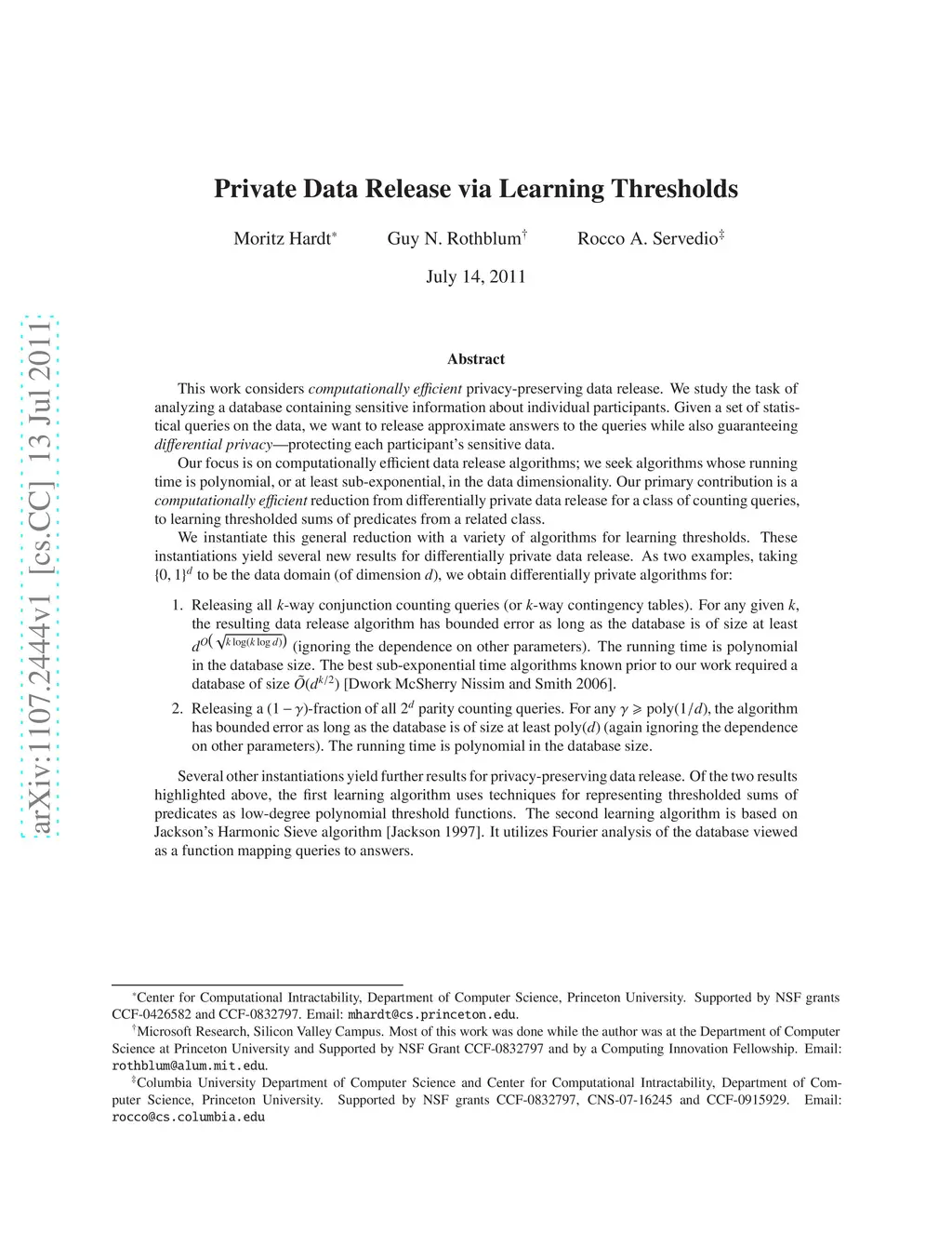 This work considers computationally efficient privacy-preserving data release. We study the task of analyzing a database containing sensitive information about individual participants. Given a set of statistical queries on the data, we want to release approximate answers to the queries while also guaranteeing differential privacy---protecting each participant's sensitive data. Our focus is on computationally efficient data release algorithms; we seek algorithms whose running time is polynomial, or at least sub-exponential, in the data dimensionality. Our primary contribution is a computationally efficient reduction from differentially private data release for a class of counting queries, to learning thresholded sums of predicates from a related class. We instantiate this general reduction with a variety of algorithms for learning thresholds. These instantiations yield several new results for differentially private data release. As two examples, taking {0,1}^d to be the data domain (of dimension d), we obtain differentially private algorithms for: (*) Releasing all k-way conjunctions. For any given k, the resulting data release algorithm has bounded error as long as the database is of size at least d^{O(\sqrt{k\log(k\log d)})}. The running time is polynomial in the database size. (*) Releasing a (1-\gamma)-fraction of all parity queries. For any \gamma \geq \poly(1/d), the algorithm has bounded error as long as the database is of size at least \poly(d). The running time is polynomial in the database size. Several other instantiations yield further results for privacy-preserving data release. Of the two results highlighted above, the first learning algorithm uses techniques for representing thresholded sums of predicates as low-degree polynomial threshold functions. The second learning algorithm is based on Jackson's Harmonic Sieve algorithm [Jackson 1997].