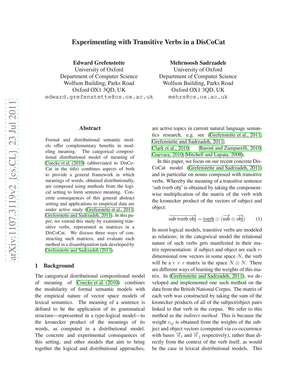Formal and distributional semantic models offer complementary benefits in modeling meaning. The categorical compositional distributional (DisCoCat) model of meaning of Coecke et al. (arXiv:1003.4394v1 [cs.CL]) combines aspected of both to provide a general framework in which meanings of words, obtained distributionally, are composed using methods from the logical setting to form sentence meaning. Concrete consequences of this general abstract setting and applications to empirical data are under active study (Grefenstette et al., arxiv:1101.0309; Grefenstette and Sadrzadeh, arXiv:1106.4058v1 [cs.CL]). . In this paper, we extend this study by examining transitive verbs, represented as matrices in a DisCoCat. We discuss three ways of constructing such matrices, and evaluate each method in a disambiguation task developed by Grefenstette and Sadrzadeh (arXiv:1106.4058v1 [cs.CL]).
