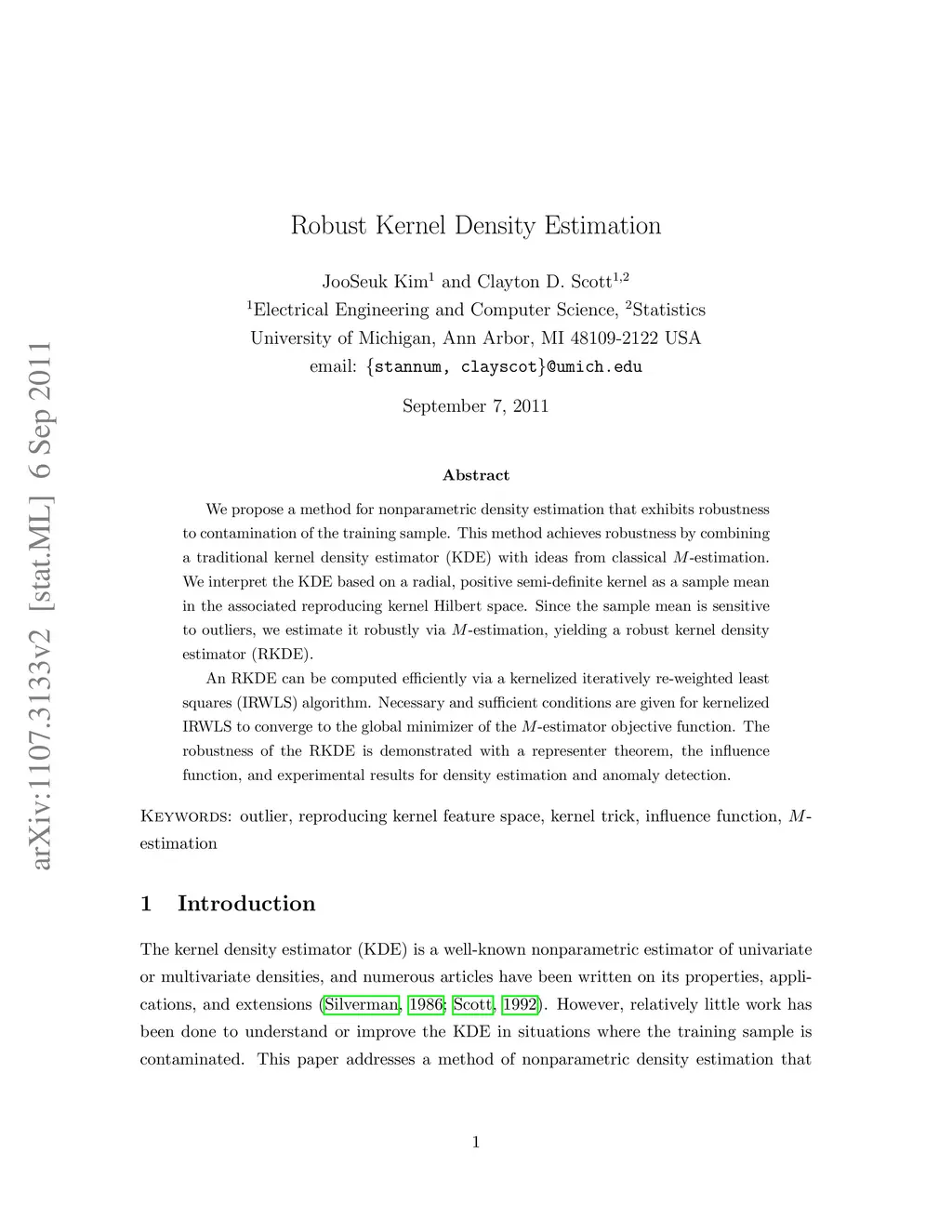 We propose a method for nonparametric density estimation that exhibits robustness to contamination of the training sample. This method achieves robustness by combining a traditional kernel density estimator (KDE) with ideas from classical -estimation. We interpret the KDE based on a radial, positive semi-definite kernel as a sample mean in the associated reproducing kernel Hilbert space. Since the sample mean is sensitive to outliers, we estimate it robustly via -estimation, yielding a robust kernel density estimator (RKDE). An RKDE can be computed efficiently via a kernelized iteratively re-weighted least squares (IRWLS) algorithm. Necessary and sufficient conditions are given for kernelized IRWLS to converge to the global minimizer of the -estimator objective function. The robustness of the RKDE is demonstrated with a representer theorem, the influence function, and experimental results for density estimation and anomaly detection.