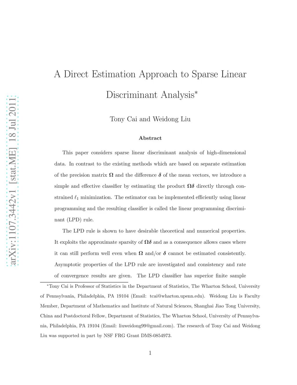 This paper considers sparse linear discriminant analysis of high-dimensional data. In contrast to the existing methods which are based on separate estimation of the precision matrix and the difference of the mean vectors, we introduce a simple and effective classifier by estimating the product directly through constrained minimization. The estimator can be implemented efficiently using linear programming and the resulting classifier is called the linear programming discriminant (LPD) rule. The LPD rule is shown to have desirable theoretical and numerical properties. It exploits the approximate sparsity of and as a consequence allows cases where it can still perform well even when and/or cannot be estimated consistently. Asymptotic properties of the LPD rule are investigated and consistency and rate of convergence results are given. The LPD classifier has superior finite sample performance and significant computational advantages over the existing methods that require separate estimation of and . The LPD rule is also applied to analyze real datasets from lung cancer and leukemia studies. The classifier performs favorably in comparison to existing methods.