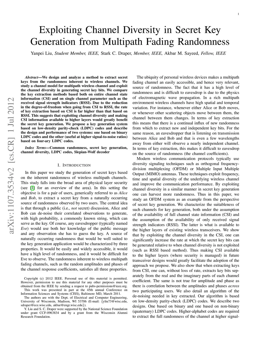 We design and analyze a method to extract secret keys from the randomness inherent to wireless channels. We study a channel model for multipath wireless channel and exploit the channel diversity in generating secret key bits. We compare the key extraction methods based both on entire channel state information (CSI) and on single channel parameter such as the received signal strength indicators (RSSI). Due to the reduction in the degree-of-freedom when going from CSI to RSSI, the rate of key extraction based on CSI is far higher than that based on RSSI. This suggests that exploiting channel diversity and making CSI information available to higher layers would greatly benefit the secret key generation. We propose a key generation system based on low-density parity-check (LDPC) codes and describe the design and performance of two systems: one based on binary LDPC codes and the other (useful at higher signal-to-noise ratios) based on four-ary LDPC codes.