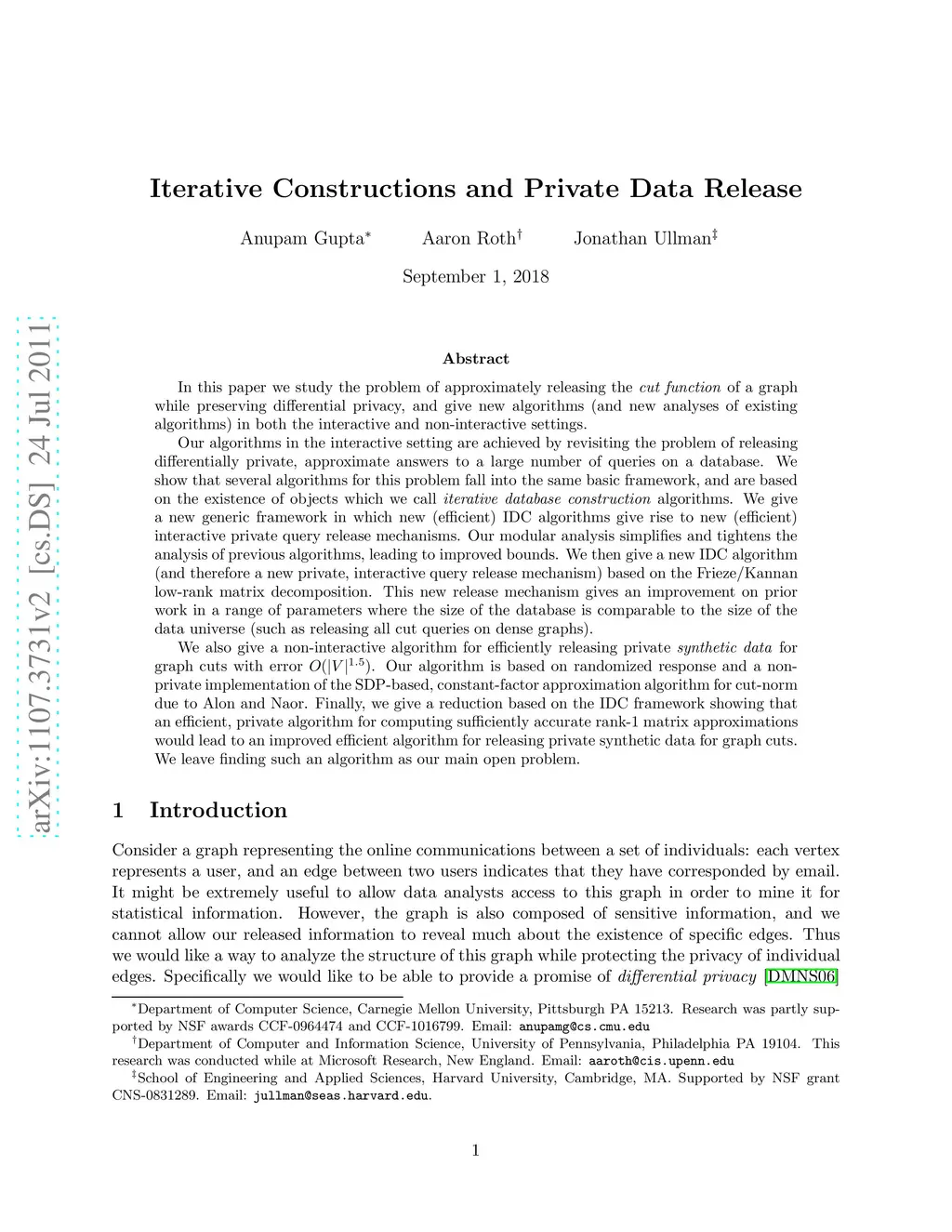 In this paper we study the problem of approximately releasing the cut function of a graph while preserving differential privacy, and give new algorithms (and new analyses of existing algorithms) in both the interactive and non-interactive settings. Our algorithms in the interactive setting are achieved by revisiting the problem of releasing differentially private, approximate answers to a large number of queries on a database. We show that several algorithms for this problem fall into the same basic framework, and are based on the existence of objects which we call iterative database construction algorithms. We give a new generic framework in which new (efficient) IDC algorithms give rise to new (efficient) interactive private query release mechanisms. Our modular analysis simplifies and tightens the analysis of previous algorithms, leading to improved bounds. We then give a new IDC algorithm (and therefore a new private, interactive query release mechanism) based on the Frieze/Kannan low-rank matrix decomposition. This new release mechanism gives an improvement on prior work in a range of parameters where the size of the database is comparable to the size of the data universe (such as releasing all cut queries on dense graphs). We also give a non-interactive algorithm for efficiently releasing private synthetic data for graph cuts with error O(|V|^{1.5}). Our algorithm is based on randomized response and a non-private implementation of the SDP-based, constant-factor approximation algorithm for cut-norm due to Alon and Naor. Finally, we give a reduction based on the IDC framework showing that an efficient, private algorithm for computing sufficiently accurate rank-1 matrix approximations would lead to an improved efficient algorithm for releasing private synthetic data for graph cuts. We leave finding such an algorithm as our main open problem.