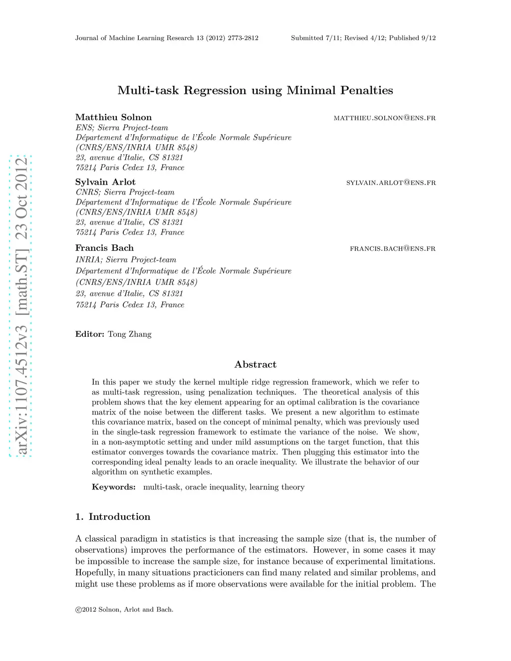 In this paper we study the kernel multiple ridge regression framework, which we refer to as multi-task regression, using penalization techniques. The theoretical analysis of this problem shows that the key element appearing for an optimal calibration is the covariance matrix of the noise between the different tasks. We present a new algorithm to estimate this covariance matrix, based on the concept of minimal penalty, which was previously used in the single-task regression framework to estimate the variance of the noise. We show, in a non-asymptotic setting and under mild assumptions on the target function, that this estimator converges towards the covariance matrix. Then plugging this estimator into the corresponding ideal penalty leads to an oracle inequality. We illustrate the behavior of our algorithm on synthetic examples.