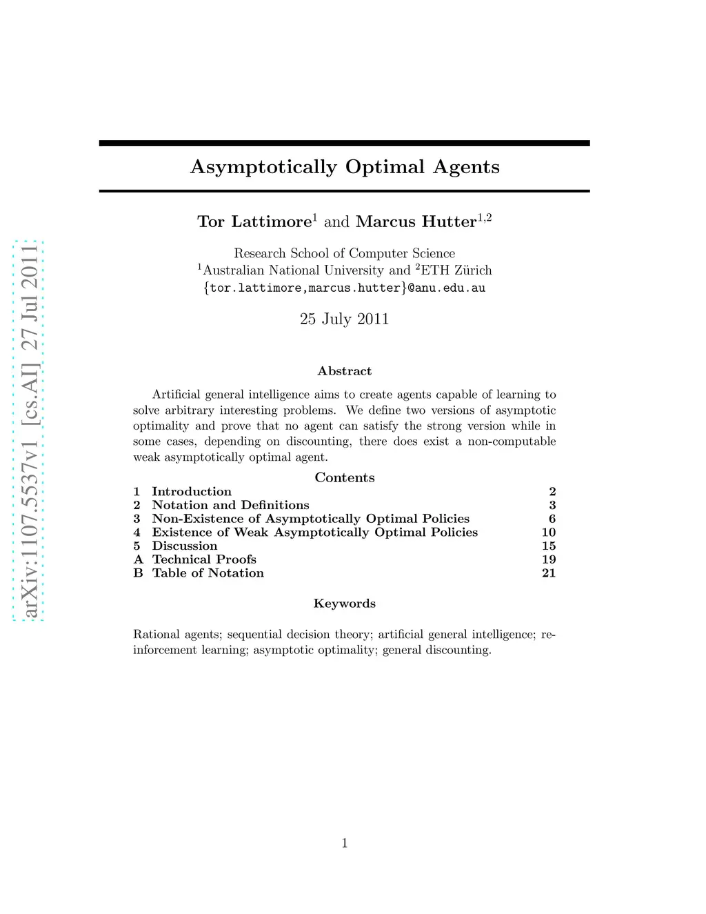 Artificial general intelligence aims to create agents capable of learning to solve arbitrary interesting problems. We define two versions of asymptotic optimality and prove that no agent can satisfy the strong version while in some cases, depending on discounting, there does exist a non-computable weak asymptotically optimal agent.
