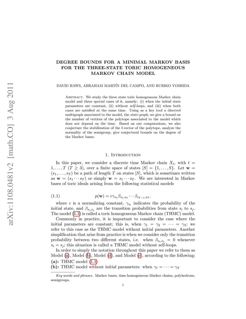 We study the three state toric homogeneous Markov chain model and three special cases of it, namely: (i) when the initial state parameters are constant, (ii) without self-loops, and (iii) when both cases are satisfied at the same time. Using as a key tool a directed multigraph associated to the model, the state-graph, we give a bound on the number of vertices of the polytope associated to the model which does not depend on the time. Based on our computations, we also conjecture the stabilization of the f-vector of the polytope, analyze the normality of the semigroup, give conjectural bounds on the degree of the Markov bases.