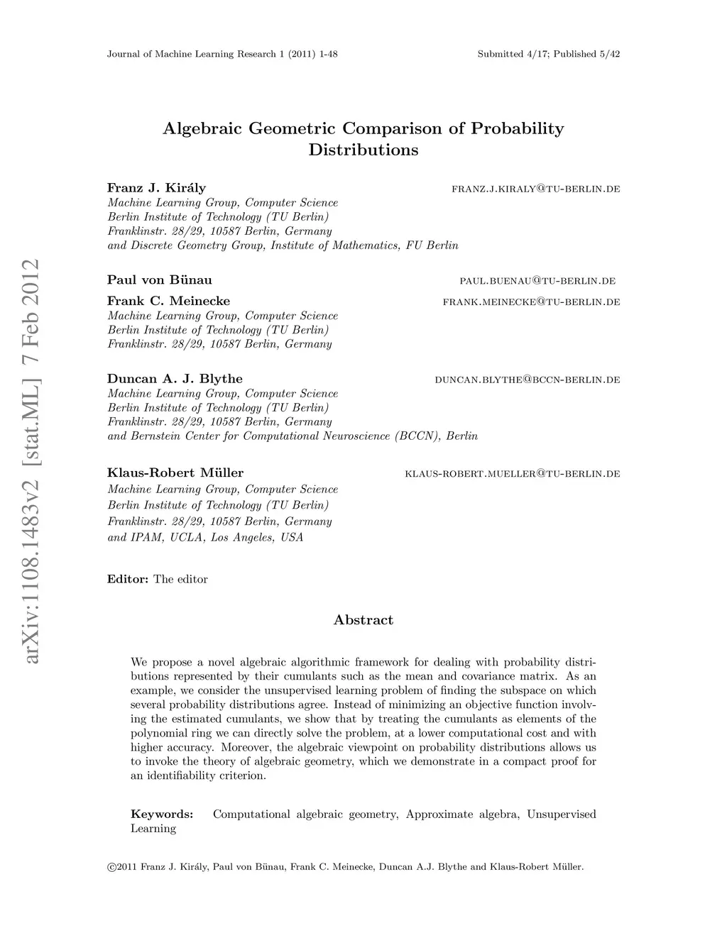 We propose a novel algebraic framework for treating probability distributions represented by their cumulants such as the mean and covariance matrix. As an example, we consider the unsupervised learning problem of finding the subspace on which several probability distributions agree. Instead of minimizing an objective function involving the estimated cumulants, we show that by treating the cumulants as elements of the polynomial ring we can directly solve the problem, at a lower computational cost and with higher accuracy. Moreover, the algebraic viewpoint on probability distributions allows us to invoke the theory of Algebraic Geometry, which we demonstrate in a compact proof for an identifiability criterion.