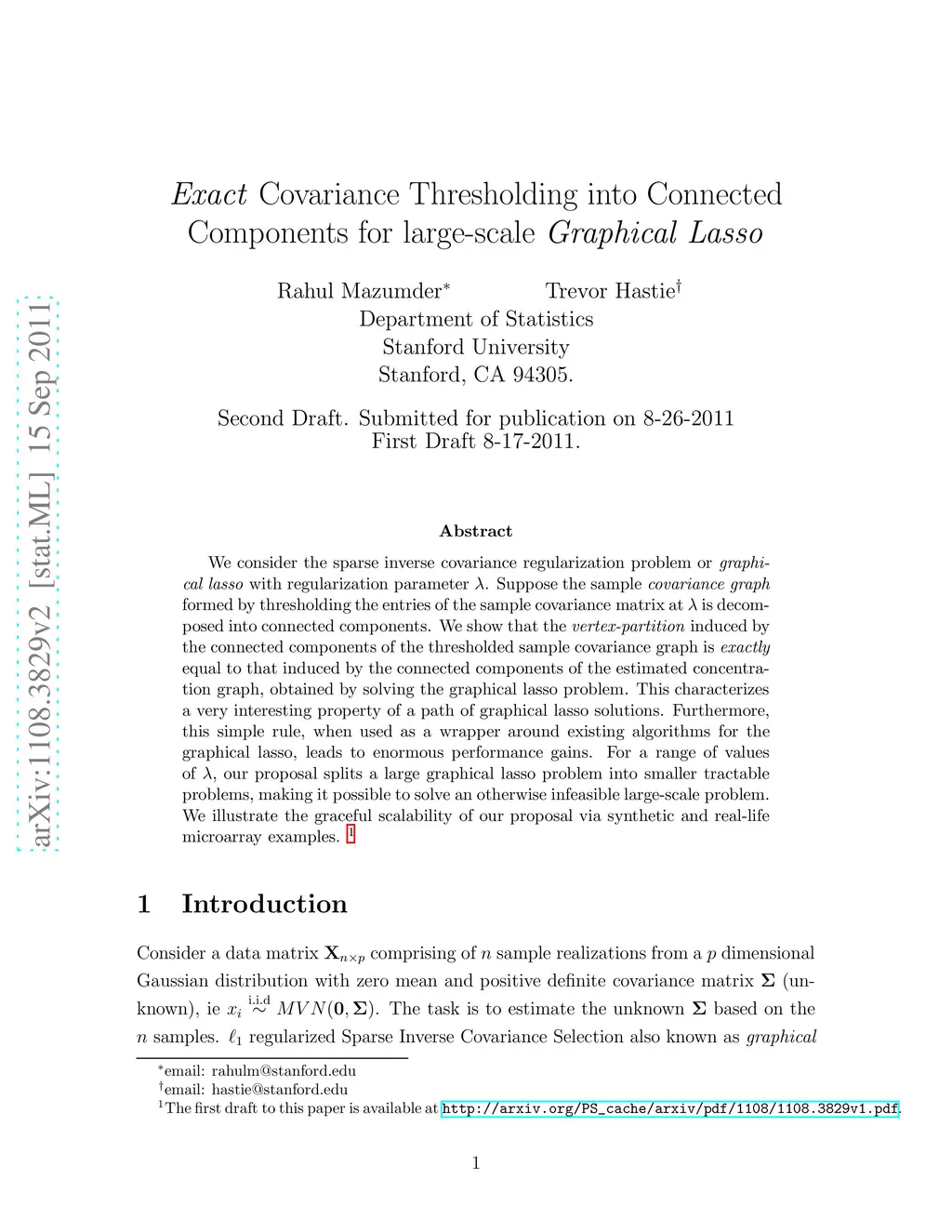 We consider the sparse inverse covariance regularization problem or graphical lasso with regularization parameter . Suppose the co- variance graph formed by thresholding the entries of the sample covariance matrix at is decomposed into connected components. We show that the vertex-partition induced by the thresholded covariance graph is exactly equal to that induced by the estimated concentration graph. This simple rule, when used as a wrapper around existing algorithms, leads to enormous performance gains. For large values of , our proposal splits a large graphical lasso problem into smaller tractable problems, making it possible to solve an otherwise infeasible large scale graphical lasso problem.