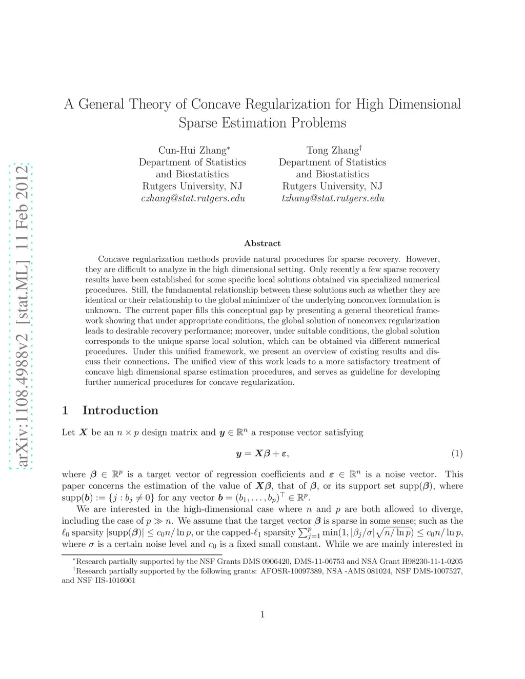 Concave regularization methods provide natural procedures for sparse recovery. However, they are difficult to analyze in the high dimensional setting. Only recently a few sparse recovery results have been established for some specific local solutions obtained via specialized numerical procedures. Still, the fundamental relationship between these solutions such as whether they are identical or their relationship to the global minimizer of the underlying nonconvex formulation is unknown. The current paper fills this conceptual gap by presenting a general theoretical framework showing that under appropriate conditions, the global solution of nonconvex regularization leads to desirable recovery performance; moreover, under suitable conditions, the global solution corresponds to the unique sparse local solution, which can be obtained via different numerical procedures. Under this unified framework, we present an overview of existing results and discuss their connections. The unified view of this work leads to a more satisfactory treatment of concave high dimensional sparse estimation procedures, and serves as guideline for developing further numerical procedures for concave regularization.
