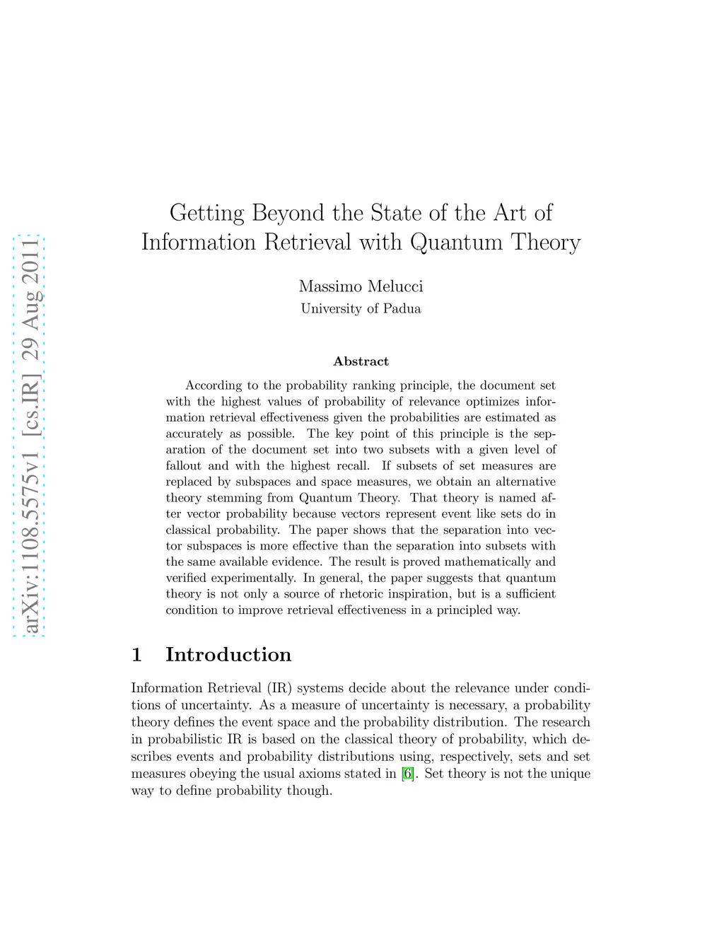 According to the probability ranking principle, the document set with the highest values of probability of relevance optimizes information retrieval effectiveness given the probabilities are estimated as accurately as possible. The key point of this principle is the separation of the document set into two subsets with a given level of fallout and with the highest recall. If subsets of set measures are replaced by subspaces and space measures, we obtain an alternative theory stemming from Quantum Theory. That theory is named after vector probability because vectors represent event like sets do in classical probability. The paper shows that the separation into vector subspaces is more effective than the separation into subsets with the same available evidence. The result is proved mathematically and verified experimentally. In general, the paper suggests that quantum theory is not only a source of rhetoric inspiration, but is a sufficient condition to improve retrieval effectiveness in a principled way.
