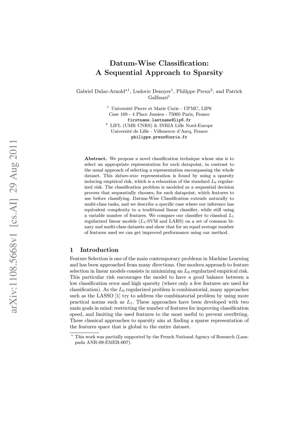 We propose a novel classification technique whose aim is to select an appropriate representation for each datapoint, in contrast to the usual approach of selecting a representation encompassing the whole dataset. This datum-wise representation is found by using a sparsity inducing empirical risk, which is a relaxation of the standard L 0 regularized risk. The classification problem is modeled as a sequential decision process that sequentially chooses, for each datapoint, which features to use before classifying. Datum-Wise Classification extends naturally to multi-class tasks, and we describe a specific case where our inference has equivalent complexity to a traditional linear classifier, while still using a variable number of features. We compare our classifier to classical L 1 regularized linear models (L 1-SVM and LARS) on a set of common binary and multi-class datasets and show that for an equal average number of features used we can get improved performance using our method.