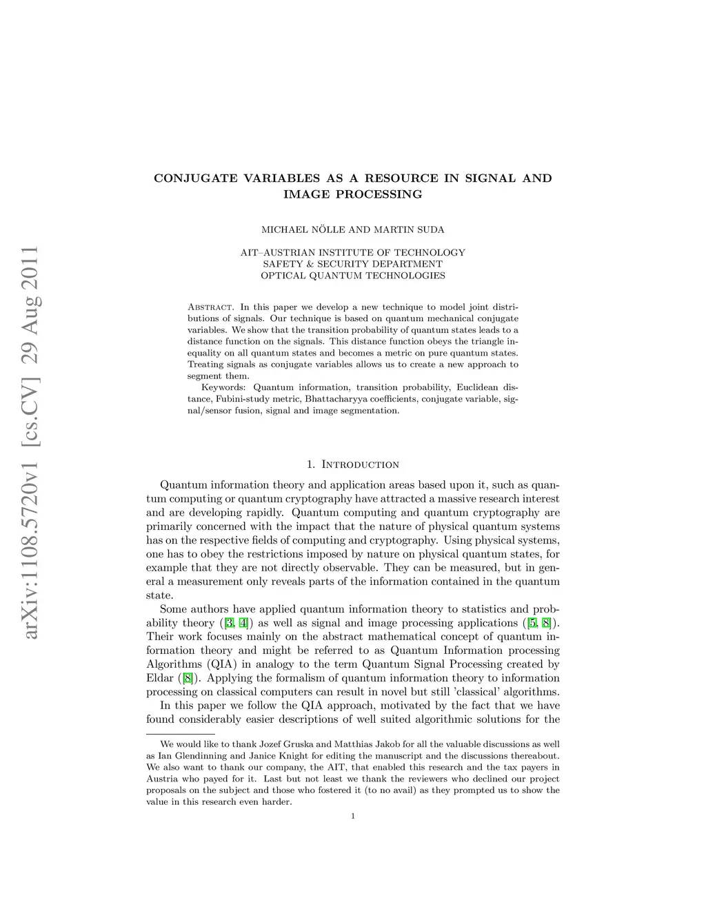 In this paper we develop a new technique to model joint distributions of signals. Our technique is based on quantum mechanical conjugate variables. We show that the transition probability of quantum states leads to a distance function on the signals. This distance function obeys the triangle inequality on all quantum states and becomes a metric on pure quantum states. Treating signals as conjugate variables allows us to create a new approach to segment them. Keywords: Quantum information, transition probability, Euclidean distance, Fubini-study metric, Bhattacharyya coefficients, conjugate variable, signal/sensor fusion, signal and image segmentation.