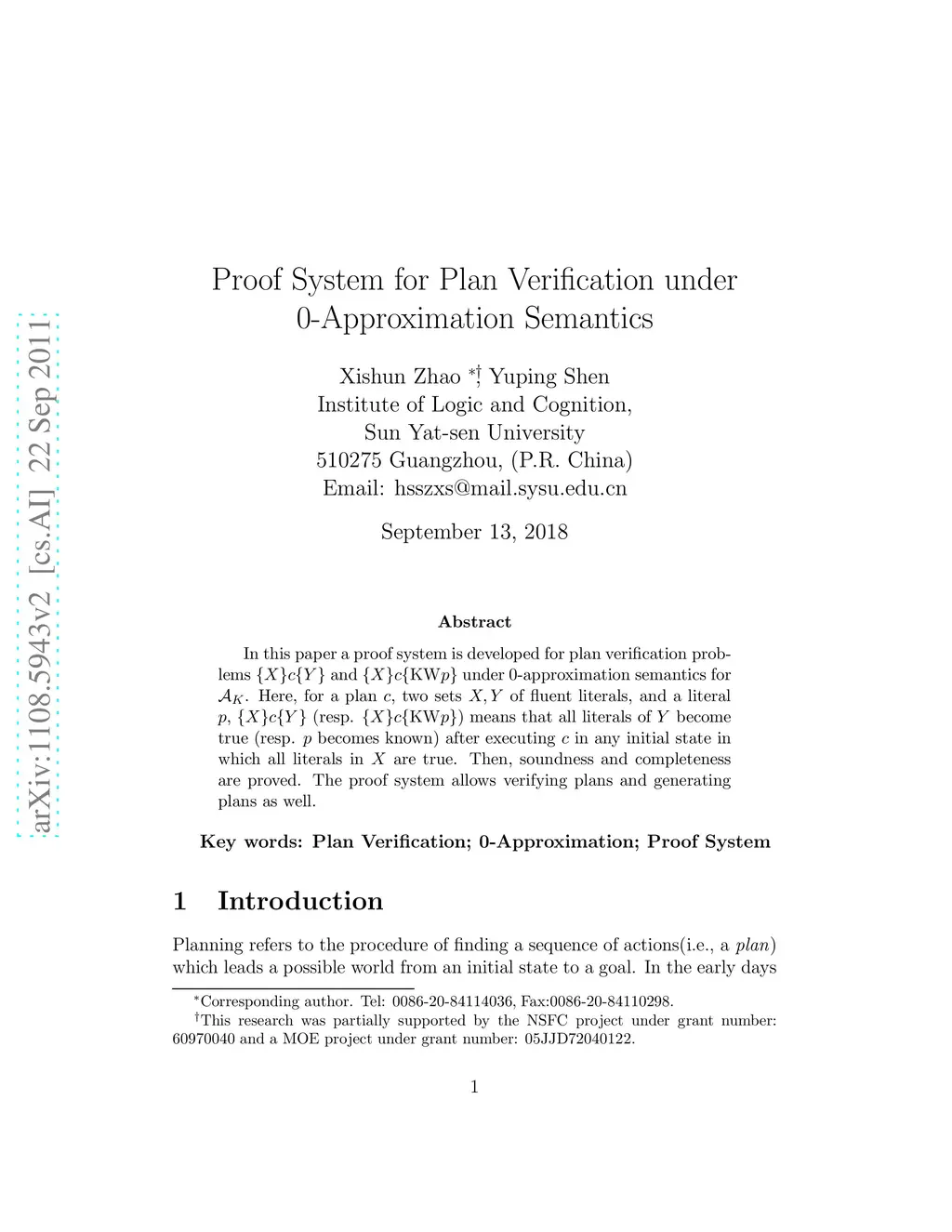 In this paper a proof system is developed for plan verification problems and under 0-approximation semantics for . Here, for a plan , two sets of fluent literals, and a literal , (resp. ) means that all literals of become true (resp. becomes known) after executing in any initial state in which all literals in are true.Then, soundness and completeness are proved. The proof system allows verifying plans and generating plans as well.