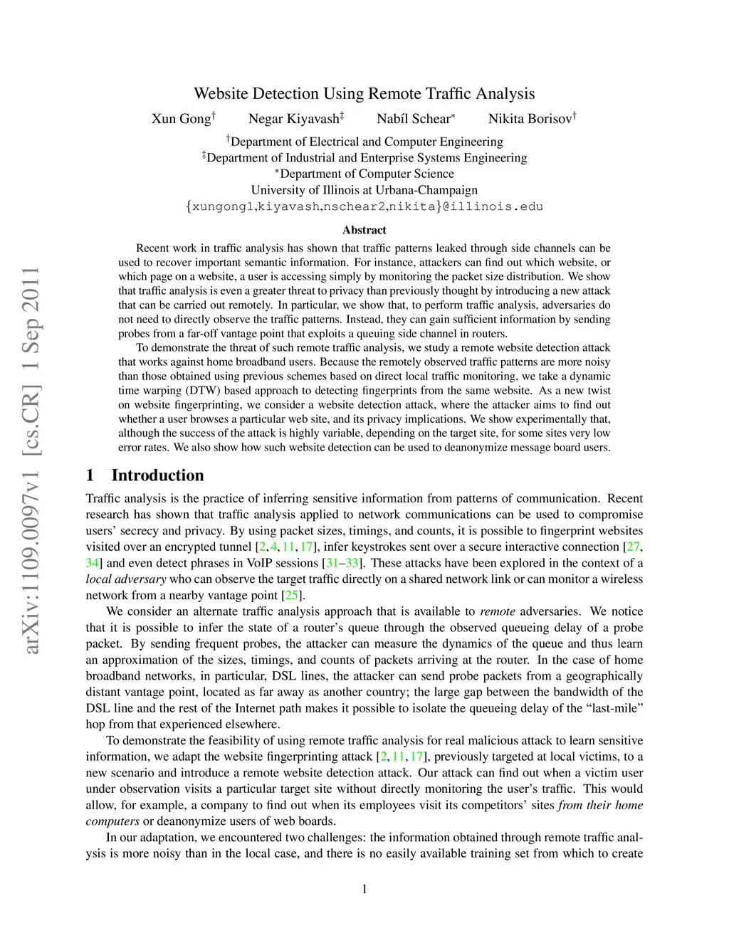 Recent work in traffic analysis has shown that traffic patterns leaked through side channels can be used to recover important semantic information. For instance, attackers can find out which website, or which page on a website, a user is accessing simply by monitoring the packet size distribution. We show that traffic analysis is even a greater threat to privacy than previously thought by introducing a new attack that can be carried out remotely. In particular, we show that, to perform traffic analysis, adversaries do not need to directly observe the traffic patterns. Instead, they can gain sufficient information by sending probes from a far-off vantage point that exploits a queuing side channel in routers. To demonstrate the threat of such remote traffic analysis, we study a remote website detection attack that works against home broadband users. Because the remotely observed traffic patterns are more noisy than those obtained using previous schemes based on direct local traffic monitoring, we take a dynamic time warping (DTW) based approach to detecting fingerprints from the same website. As a new twist on website fingerprinting, we consider a website detection attack, where the attacker aims to find out whether a user browses a particular web site, and its privacy implications. We show experimentally that, although the success of the attack is highly variable, depending on the target site, for some sites very low error rates. We also show how such website detection can be used to deanonymize message board users.