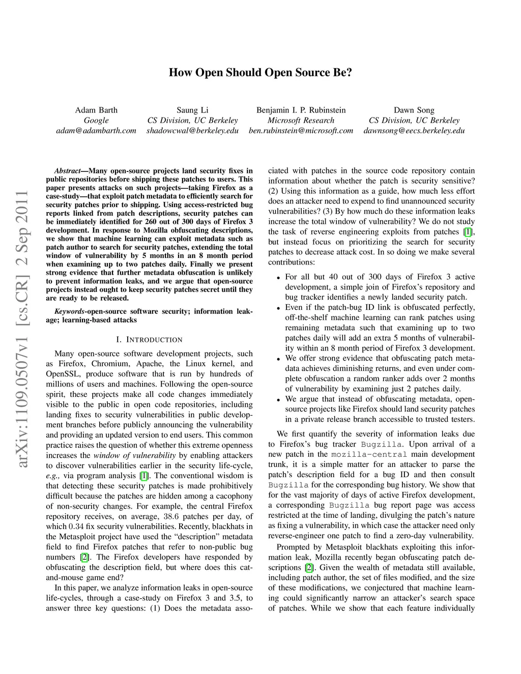 Many open-source projects land security fixes in public repositories before shipping these patches to users. This paper presents attacks on such projects - taking Firefox as a case-study - that exploit patch metadata to efficiently search for security patches prior to shipping. Using access-restricted bug reports linked from patch descriptions, security patches can be immediately identified for 260 out of 300 days of Firefox 3 development. In response to Mozilla obfuscating descriptions, we show that machine learning can exploit metadata such as patch author to search for security patches, extending the total window of vulnerability by 5 months in an 8 month period when examining up to two patches daily. Finally we present strong evidence that further metadata obfuscation is unlikely to prevent information leaks, and we argue that open-source projects instead ought to keep security patches secret until they are ready to be released.