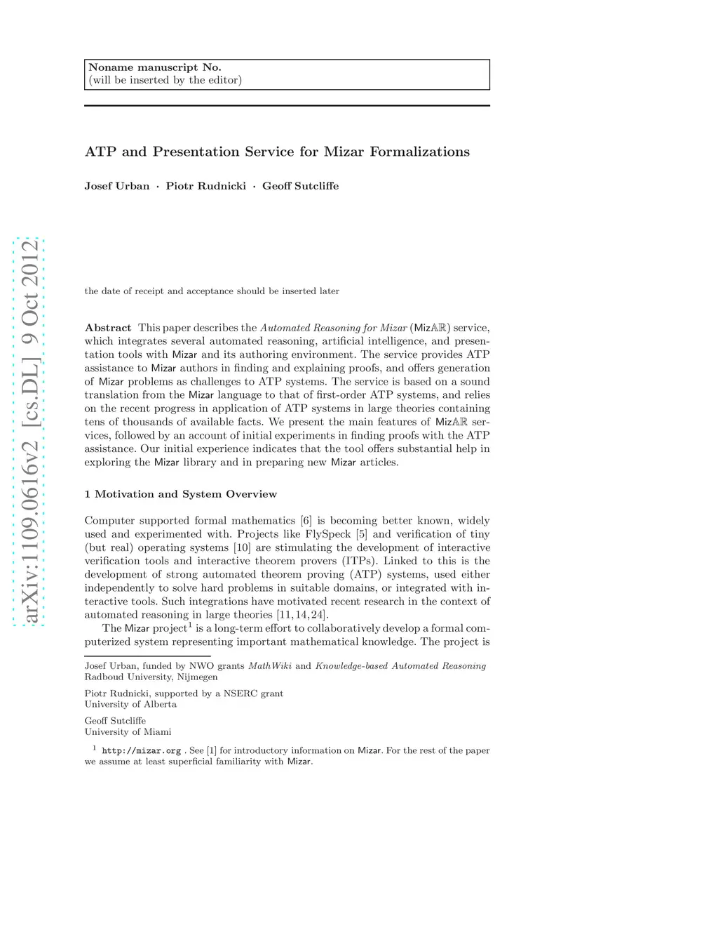 This paper describes the Automated Reasoning for Mizar (MizAR) service, which integrates several automated reasoning, artificial intelligence, and presentation tools with Mizar and its authoring environment. The service provides ATP assistance to Mizar authors in finding and explaining proofs, and offers generation of Mizar problems as challenges to ATP systems. The service is based on a sound translation from the Mizar language to that of first-order ATP systems, and relies on the recent progress in application of ATP systems in large theories containing tens of thousands of available facts. We present the main features of MizAR services, followed by an account of initial experiments in finding proofs with the ATP assistance. Our initial experience indicates that the tool offers substantial help in exploring the Mizar library and in preparing new Mizar articles.