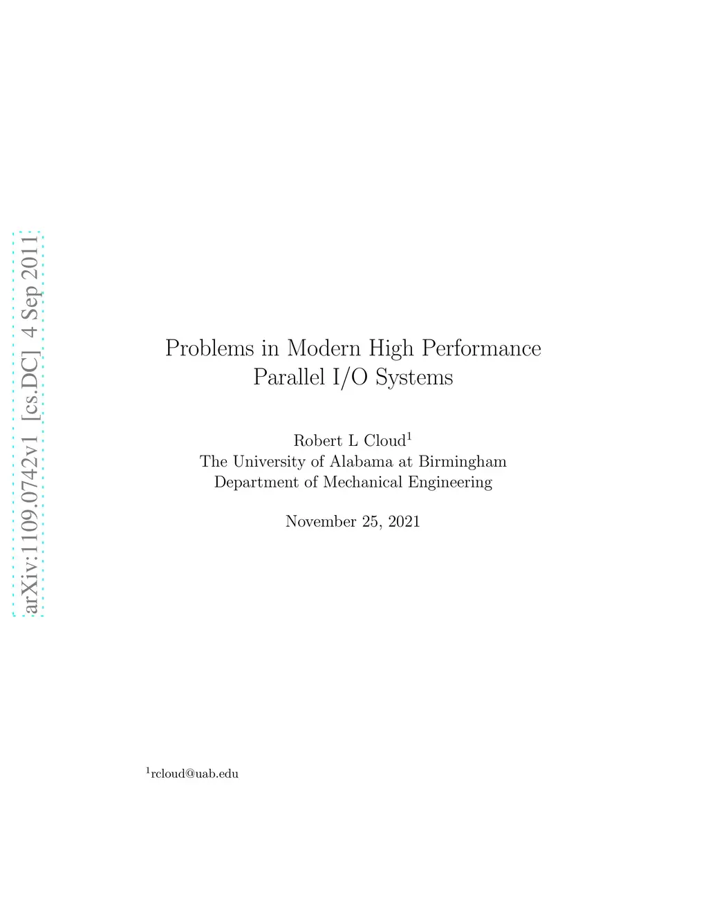 In the past couple of decades, the computational abilities of supercomput- ers have increased tremendously. Leadership scale supercomputers now are capable of petaflops. Likewise, the problem size targeted by applications running on such computers has also scaled. These large applications have I/O throughput requirements on the order of tens of gigabytes per second. For a variety of reasons, the I/O subsystems of such computers have not kept pace with the computational increases, and the time required for I/O in an application has become one of the dominant bottlenecks. Also troublesome is the fact that scientific applications do not attain near the peak theoretical bandwidth of the I/O subsystems. In addressing the two prior issues, one must also question the nature of the data itself; one can ask whether contem- porary practices of data dumping and analysis are optimal and whether they will continue to be applicable as computers continue to scale. These three topics, the I/O subsystem, the nature of scientific data output, and future possible optimizations are discussed in this report.