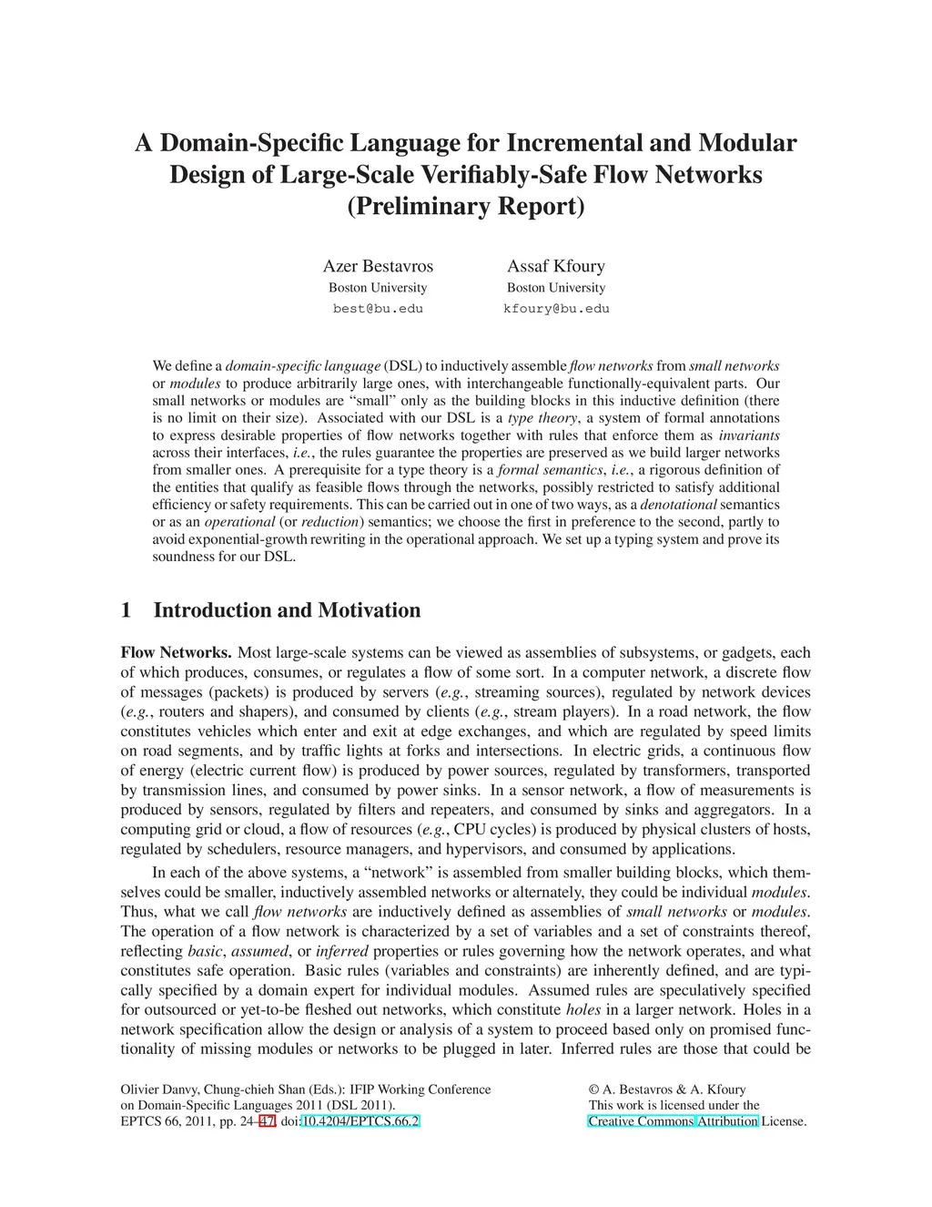 We define a domain-specific language (DSL) to inductively assemble flow networks from small networks or modules to produce arbitrarily large ones, with interchangeable functionally-equivalent parts. Our small networks or modules are "small" only as the building blocks in this inductive definition (there is no limit on their size). Associated with our DSL is a type theory, a system of formal annotations to express desirable properties of flow networks together with rules that enforce them as invariants across their interfaces, i.e, the rules guarantee the properties are preserved as we build larger networks from smaller ones. A prerequisite for a type theory is a formal semantics, i.e, a rigorous definition of the entities that qualify as feasible flows through the networks, possibly restricted to satisfy additional efficiency or safety requirements. This can be carried out in one of two ways, as a denotational semantics or as an operational (or reduction) semantics; we choose the first in preference to the second, partly to avoid exponential-growth rewriting in the operational approach. We set up a typing system and prove its soundness for our DSL.
