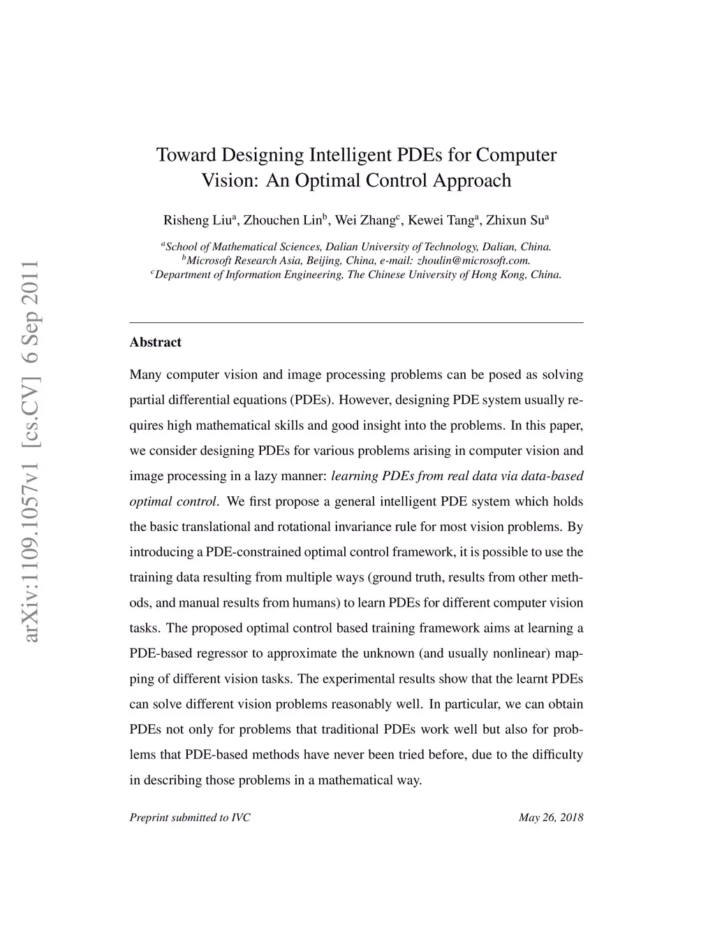 Many computer vision and image processing problems can be posed as solving partial differential equations (PDEs). However, designing PDE system usually requires high mathematical skills and good insight into the problems. In this paper, we consider designing PDEs for various problems arising in computer vision and image processing in a lazy manner: \emph{learning PDEs from real data via data-based optimal control}. We first propose a general intelligent PDE system which holds the basic translational and rotational invariance rule for most vision problems. By introducing a PDE-constrained optimal control framework, it is possible to use the training data resulting from multiple ways (ground truth, results from other methods, and manual results from humans) to learn PDEs for different computer vision tasks. The proposed optimal control based training framework aims at learning a PDE-based regressor to approximate the unknown (and usually nonlinear) mapping of different vision tasks. The experimental results show that the learnt PDEs can solve different vision problems reasonably well. In particular, we can obtain PDEs not only for problems that traditional PDEs work well but also for problems that PDE-based methods have never been tried before, due to the difficulty in describing those problems in a mathematical way.
