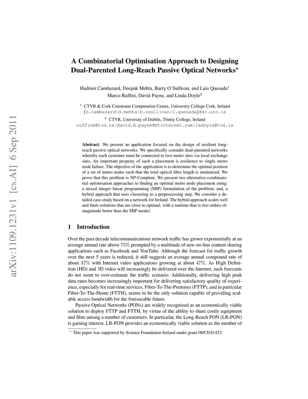 We present an application focused on the design of resilient long-reach passive optical networks. We specifically consider dual-parented networks whereby each customer must be connected to two metro sites via local exchange sites. An important property of such a placement is resilience to single metro node failure. The objective of the application is to determine the optimal position of a set of metro nodes such that the total optical fibre length is minimized. We prove that this problem is NP-Complete. We present two alternative combinatorial optimisation approaches to finding an optimal metro node placement using: a mixed integer linear programming (MIP) formulation of the problem; and, a hybrid approach that uses clustering as a preprocessing step. We consider a detailed case-study based on a network for Ireland. The hybrid approach scales well and finds solutions that are close to optimal, with a runtime that is two orders-of-magnitude better than the MIP model.