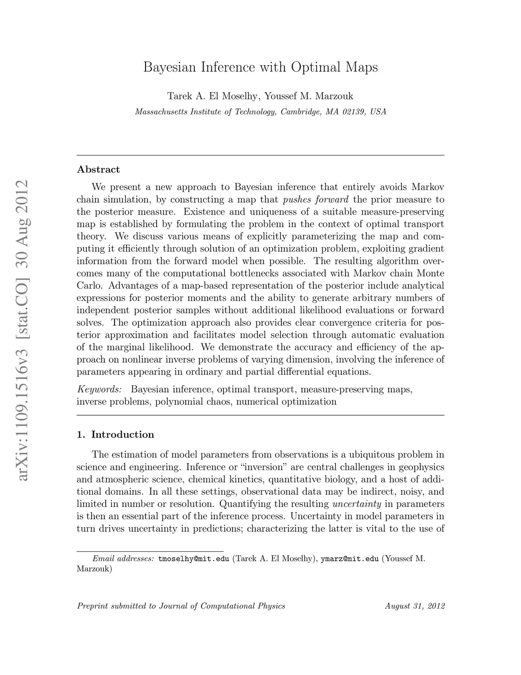 We present a new approach to Bayesian inference that entirely avoids Markov chain simulation, by constructing a map that pushes forward the prior measure to the posterior measure. Existence and uniqueness of a suitable measure-preserving map is established by formulating the problem in the context of optimal transport theory. We discuss various means of explicitly parameterizing the map and computing it efficiently through solution of an optimization problem, exploiting gradient information from the forward model when possible. The resulting algorithm overcomes many of the computational bottlenecks associated with Markov chain Monte Carlo. Advantages of a map-based representation of the posterior include analytical expressions for posterior moments and the ability to generate arbitrary numbers of independent posterior samples without additional likelihood evaluations or forward solves. The optimization approach also provides clear convergence criteria for posterior approximation and facilitates model selection through automatic evaluation of the marginal likelihood. We demonstrate the accuracy and efficiency of the approach on nonlinear inverse problems of varying dimension, involving the inference of parameters appearing in ordinary and partial differential equations.