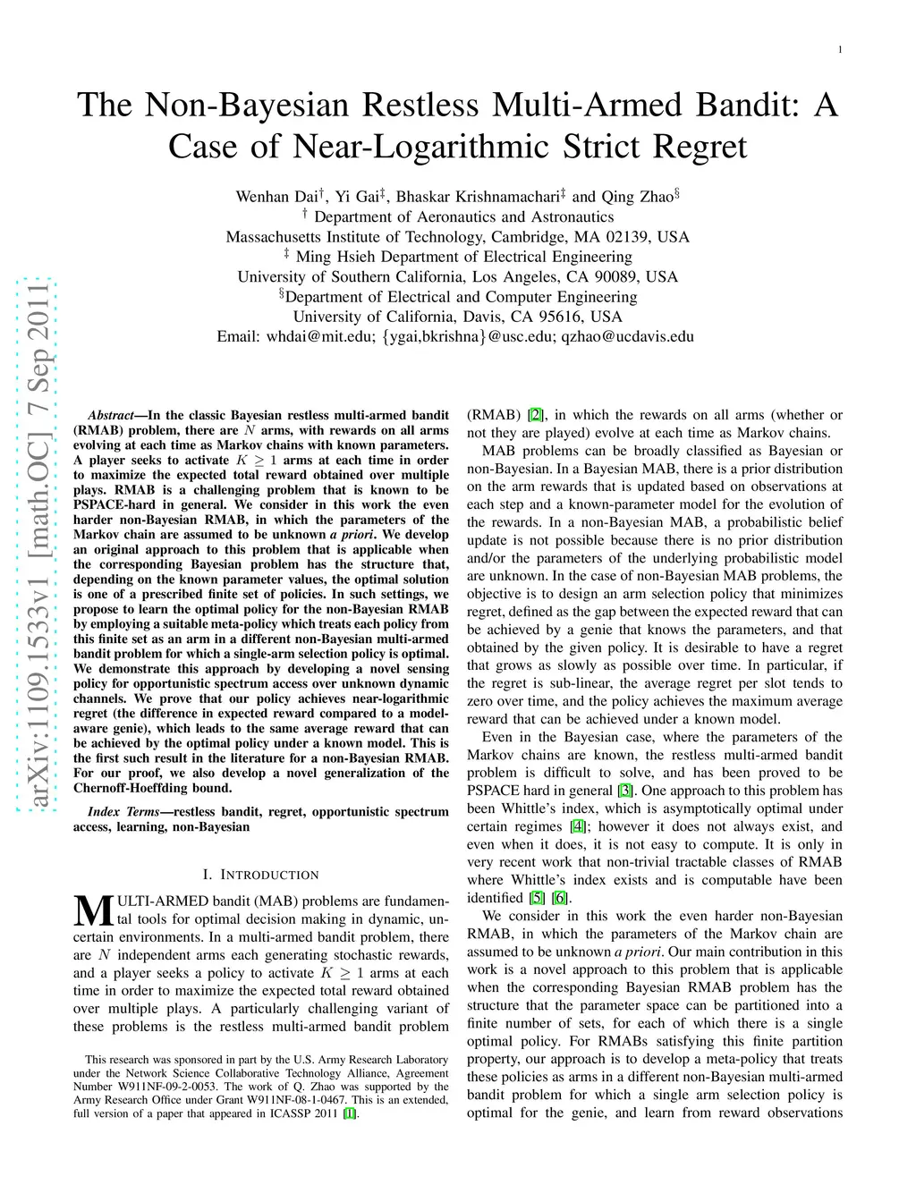 In the classic Bayesian restless multi-armed bandit (RMAB) problem, there are arms, with rewards on all arms evolving at each time as Markov chains with known parameters. A player seeks to activate arms at each time in order to maximize the expected total reward obtained over multiple plays. RMAB is a challenging problem that is known to be PSPACE-hard in general. We consider in this work the even harder non-Bayesian RMAB, in which the parameters of the Markov chain are assumed to be unknown \emph{a priori}. We develop an original approach to this problem that is applicable when the corresponding Bayesian problem has the structure that, depending on the known parameter values, the optimal solution is one of a prescribed finite set of policies. In such settings, we propose to learn the optimal policy for the non-Bayesian RMAB by employing a suitable meta-policy which treats each policy from this finite set as an arm in a different non-Bayesian multi-armed bandit problem for which a single-arm selection policy is optimal. We demonstrate this approach by developing a novel sensing policy for opportunistic spectrum access over unknown dynamic channels. We prove that our policy achieves near-logarithmic regret (the difference in expected reward compared to a model-aware genie), which leads to the same average reward that can be achieved by the optimal policy under a known model. This is the first such result in the literature for a non-Bayesian RMAB. For our proof, we also develop a novel generalization of the Chernoff-Hoeffding bound.