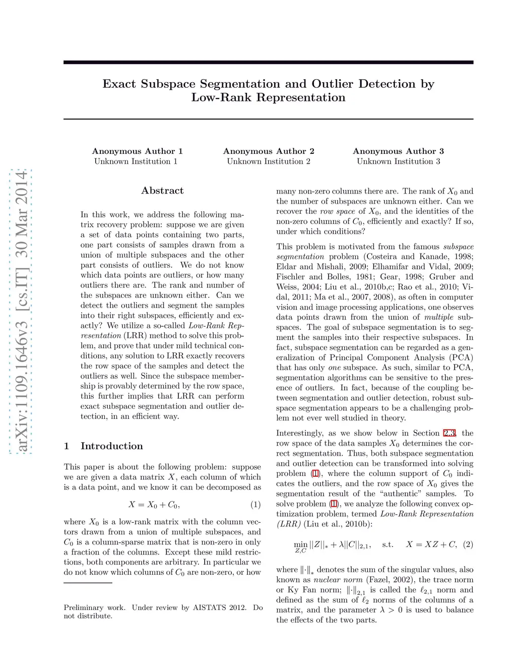 Exact Subspace Segmentation and Outlier Detection by Low-Rank