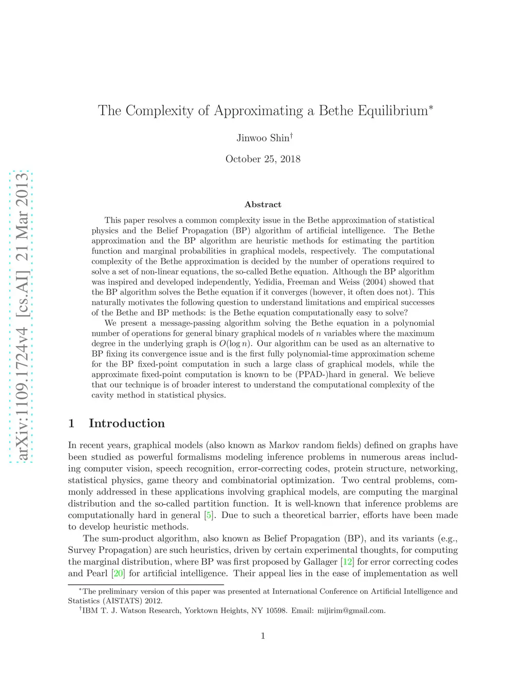 This paper resolves a common complexity issue in the Bethe approximation of statistical physics and the Belief Propagation (BP) algorithm of artificial intelligence. The Bethe approximation and the BP algorithm are heuristic methods for estimating the partition function and marginal probabilities in graphical models, respectively. The computational complexity of the Bethe approximation is decided by the number of operations required to solve a set of non-linear equations, the so-called Bethe equation. Although the BP algorithm was inspired and developed independently, Yedidia, Freeman and Weiss (2004) showed that the BP algorithm solves the Bethe equation if it converges (however, it often does not). This naturally motivates the following question to understand limitations and empirical successes of the Bethe and BP methods: is the Bethe equation computationally easy to solve? We present a message-passing algorithm solving the Bethe equation in a polynomial number of operations for general binary graphical models of n variables where the maximum degree in the underlying graph is O(log n). Our algorithm can be used as an alternative to BP fixing its convergence issue and is the first fully polynomial-time approximation scheme for the BP fixed-point computation in such a large class of graphical models, while the approximate fixed-point computation is known to be (PPAD-)hard in general. We believe that our technique is of broader interest to understand the computational complexity of the cavity method in statistical physics.
