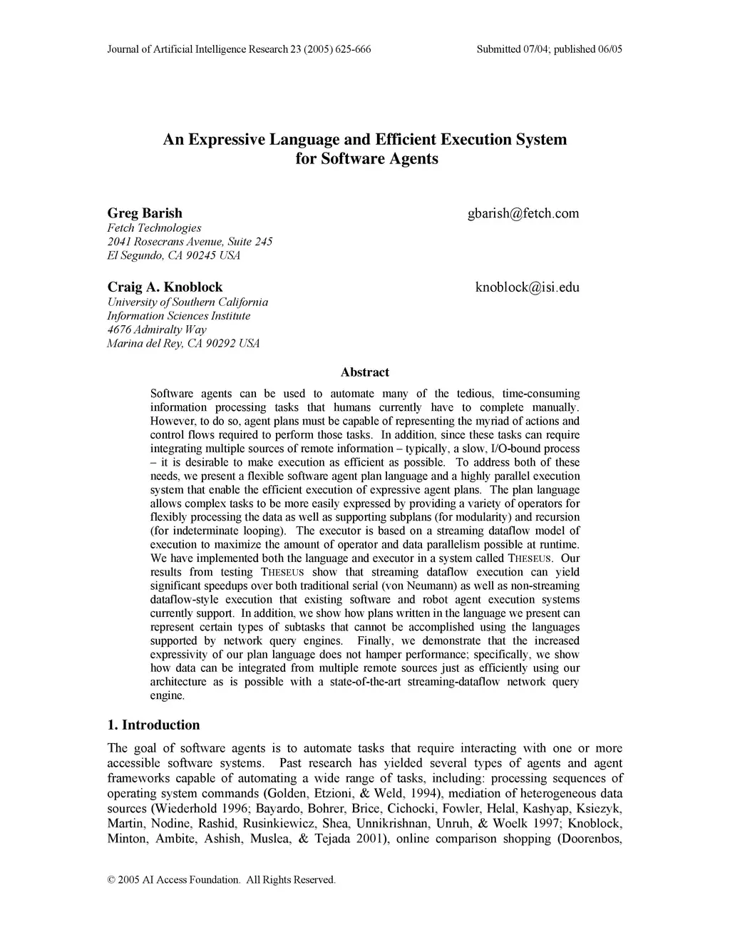Software agents can be used to automate many of the tedious, time-consuming information processing tasks that humans currently have to complete manually. However, to do so, agent plans must be capable of representing the myriad of actions and control flows required to perform those tasks. In addition, since these tasks can require integrating multiple sources of remote information ? typically, a slow, I/O-bound process ? it is desirable to make execution as efficient as possible. To address both of these needs, we present a flexible software agent plan language and a highly parallel execution system that enable the efficient execution of expressive agent plans. The plan language allows complex tasks to be more easily expressed by providing a variety of operators for flexibly processing the data as well as supporting subplans (for modularity) and recursion (for indeterminate looping). The executor is based on a streaming dataflow model of execution to maximize the amount of operator and data parallelism possible at runtime. We have implemented both the language and executor in a system called THESEUS. Our results from testing THESEUS show that streaming dataflow execution can yield significant speedups over both traditional serial (von Neumann) as well as non-streaming dataflow-style execution that existing software and robot agent execution systems currently support. In addition, we show how plans written in the language we present can represent certain types of subtasks that cannot be accomplished using the languages supported by network query engines. Finally, we demonstrate that the increased expressivity of our plan language does not hamper performance; specifically, we show how data can be integrated from multiple remote sources just as efficiently using our architecture as is possible with a state-of-the-art streaming-dataflow network query engine.