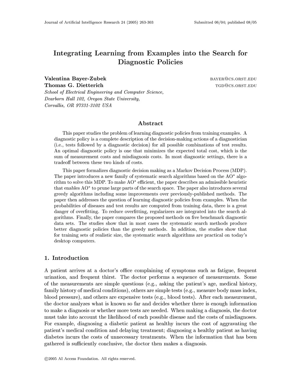 This paper studies the problem of learning diagnostic policies from training examples. A diagnostic policy is a complete description of the decision-making actions of a diagnostician (i.e., tests followed by a diagnostic decision) for all possible combinations of test results. An optimal diagnostic policy is one that minimizes the expected total cost, which is the sum of measurement costs and misdiagnosis costs. In most diagnostic settings, there is a tradeoff between these two kinds of costs. This paper formalizes diagnostic decision making as a Markov Decision Process (MDP). The paper introduces a new family of systematic search algorithms based on the AO* algorithm to solve this MDP. To make AO* efficient, the paper describes an admissible heuristic that enables AO* to prune large parts of the search space. The paper also introduces several greedy algorithms including some improvements over previously-published methods. The paper then addresses the question of learning diagnostic policies from examples. When the probabilities of diseases and test results are computed from training data, there is a great danger of overfitting. To reduce overfitting, regularizers are integrated into the search algorithms. Finally, the paper compares the proposed methods on five benchmark diagnostic data sets. The studies show that in most cases the systematic search methods produce better diagnostic policies than the greedy methods. In addition, the studies show that for training sets of realistic size, the systematic search algorithms are practical on todays desktop computers.