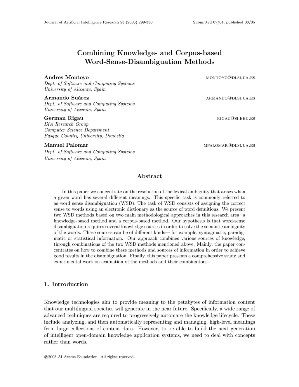 In this paper we concentrate on the resolution of the lexical ambiguity that arises when a given word has several different meanings. This specific task is commonly referred to as word sense disambiguation (WSD). The task of WSD consists of assigning the correct sense to words using an electronic dictionary as the source of word definitions. We present two WSD methods based on two main methodological approaches in this research area: a knowledge-based method and a corpus-based method. Our hypothesis is that word-sense disambiguation requires several knowledge sources in order to solve the semantic ambiguity of the words. These sources can be of different kinds--- for example, syntagmatic, paradigmatic or statistical information. Our approach combines various sources of knowledge, through combinations of the two WSD methods mentioned above. Mainly, the paper concentrates on how to combine these methods and sources of information in order to achieve good results in the disambiguation. Finally, this paper presents a comprehensive study and experimental work on evaluation of the methods and their combinations.