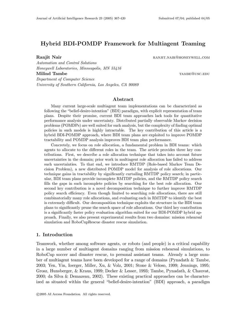 Many current large-scale multiagent team implementations can be characterized as following the belief-desire-intention (BDI) paradigm, with explicit representation of team plans. Despite their promise, current BDI team approaches lack tools for quantitative performance analysis under uncertainty. Distributed partially observable Markov decision problems (POMDPs) are well suited for such analysis, but the complexity of finding optimal policies in such models is highly intractable. The key contribution of this article is a hybrid BDI-POMDP approach, where BDI team plans are exploited to improve POMDP tractability and POMDP analysis improves BDI team plan performance. Concretely, we focus on role allocation, a fundamental problem in BDI teams: which agents to allocate to the different roles in the team. The article provides three key contributions. First, we describe a role allocation technique that takes into account future uncertainties in the domain; prior work in multiagent role allocation has failed to address such uncertainties. To that end, we introduce RMTDP (Role-based Markov Team Decision Problem), a new distributed POMDP model for analysis of role allocations. Our technique gains in tractability by significantly curtailing RMTDP policy search; in particular, BDI team plans provide incomplete RMTDP policies, and the RMTDP policy search fills the gaps in such incomplete policies by searching for the best role allocation. Our second key contribution is a novel decomposition technique to further improve RMTDP policy search efficiency. Even though limited to searching role allocations, there are still combinatorially many role allocations, and evaluating each in RMTDP to identify the best is extremely difficult. Our decomposition technique exploits the structure in the BDI team plans to significantly prune the search space of role allocations. Our third key contribution is a significantly faster policy evaluation algorithm suited for our BDI-POMDP hybrid approach. Finally, we also present experimental results from two domains: mission rehearsal simulation and RoboCupRescue disaster rescue simulation.