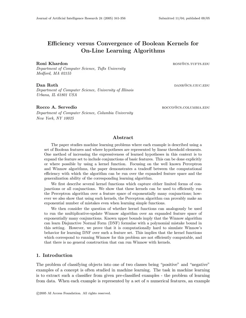 Efficiency versus Convergence of Boolean Kernels for On-Line Learning