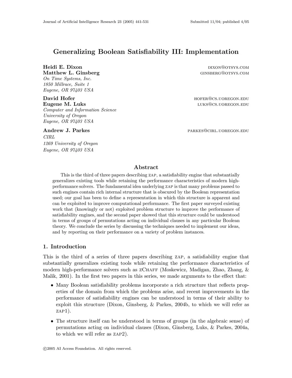This is the third of three papers describing ZAP, a satisfiability engine that substantially generalizes existing tools while retaining the performance characteristics of modern high-performance solvers. The fundamental idea underlying ZAP is that many problems passed to such engines contain rich internal structure that is obscured by the Boolean representation used; our goal has been to define a representation in which this structure is apparent and can be exploited to improve computational performance. The first paper surveyed existing work that (knowingly or not) exploited problem structure to improve the performance of satisfiability engines, and the second paper showed that this structure could be understood in terms of groups of permutations acting on individual clauses in any particular Boolean theory. We conclude the series by discussing the techniques needed to implement our ideas, and by reporting on their performance on a variety of problem instances.