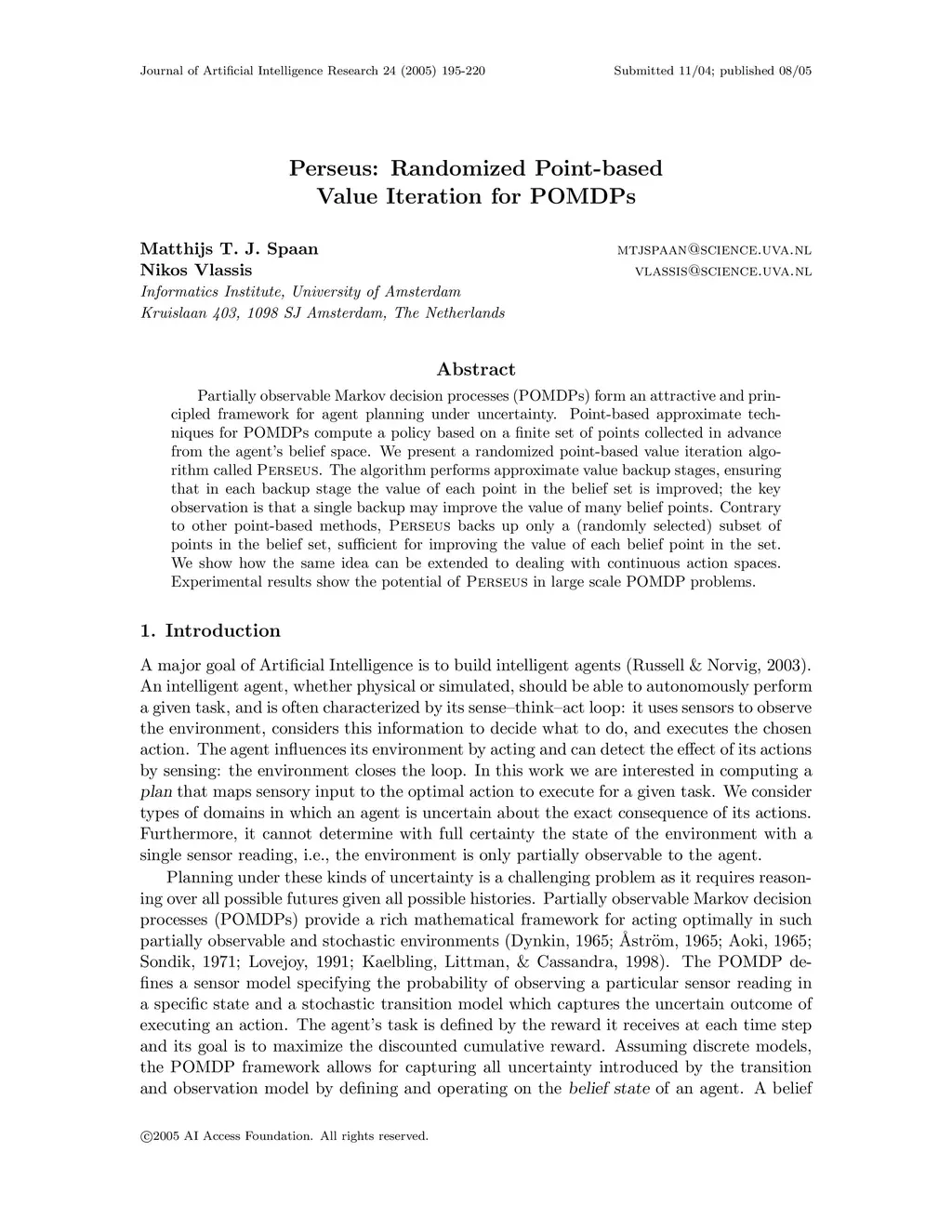 Partially observable Markov decision processes (POMDPs) form an attractive and principled framework for agent planning under uncertainty. Point-based approximate techniques for POMDPs compute a policy based on a finite set of points collected in advance from the agents belief space. We present a randomized point-based value iteration algorithm called Perseus. The algorithm performs approximate value backup stages, ensuring that in each backup stage the value of each point in the belief set is improved; the key observation is that a single backup may improve the value of many belief points. Contrary to other point-based methods, Perseus backs up only a (randomly selected) subset of points in the belief set, sufficient for improving the value of each belief point in the set. We show how the same idea can be extended to dealing with continuous action spaces. Experimental results show the potential of Perseus in large scale POMDP problems.