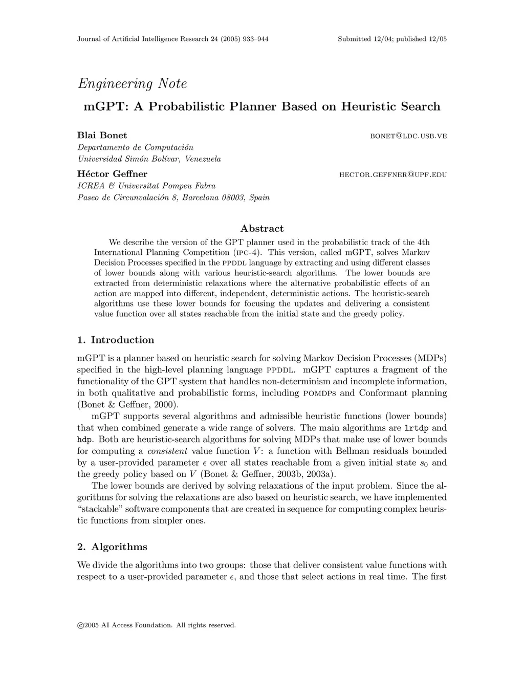 We describe the version of the GPT planner used in the probabilistic track of the 4th International Planning Competition (IPC-4). This version, called mGPT, solves Markov Decision Processes specified in the PPDDL language by extracting and using different classes of lower bounds along with various heuristic-search algorithms. The lower bounds are extracted from deterministic relaxations where the alternative probabilistic effects of an action are mapped into different, independent, deterministic actions. The heuristic-search algorithms use these lower bounds for focusing the updates and delivering a consistent value function over all states reachable from the initial state and the greedy policy.