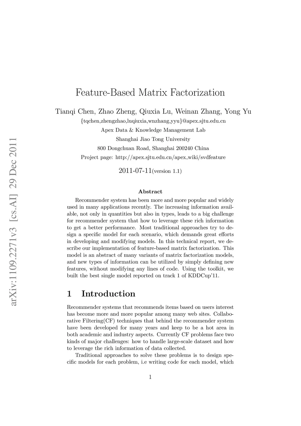 Recommender system has been more and more popular and widely used in many applications recently. The increasing information available, not only in quantities but also in types, leads to a big challenge for recommender system that how to leverage these rich information to get a better performance. Most traditional approaches try to design a specific model for each scenario, which demands great efforts in developing and modifying models. In this technical report, we describe our implementation of feature-based matrix factorization. This model is an abstract of many variants of matrix factorization models, and new types of information can be utilized by simply defining new features, without modifying any lines of code. Using the toolkit, we built the best single model reported on track 1 of KDDCup'11.