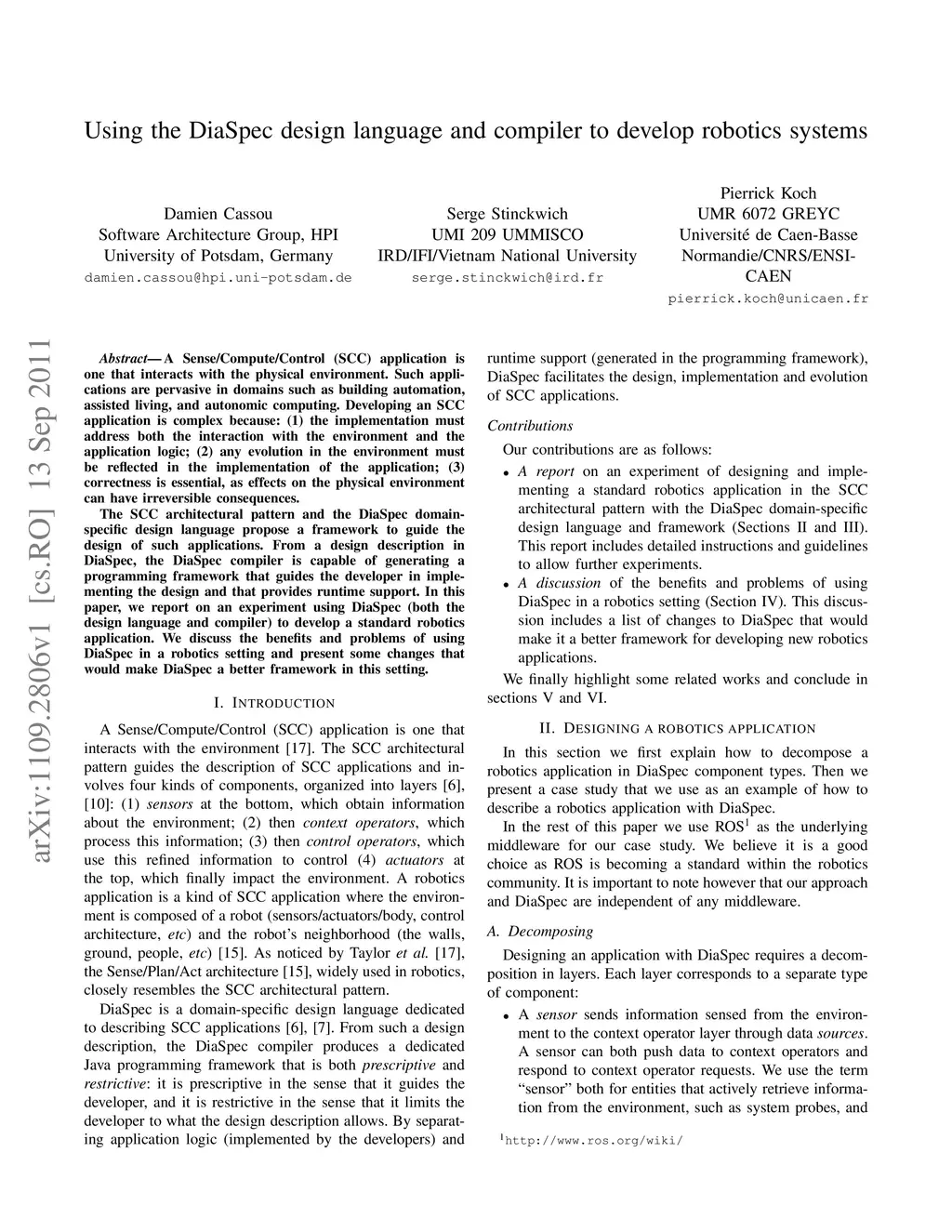 A Sense/Compute/Control (SCC) application is one that interacts with the physical environment. Such applications are pervasive in domains such as building automation, assisted living, and autonomic computing. Developing an SCC application is complex because: (1) the implementation must address both the interaction with the environment and the application logic; (2) any evolution in the environment must be reflected in the implementation of the application; (3) correctness is essential, as effects on the physical environment can have irreversible consequences. The SCC architectural pattern and the DiaSpec domain-specific design language propose a framework to guide the design of such applications. From a design description in DiaSpec, the DiaSpec compiler is capable of generating a programming framework that guides the developer in implementing the design and that provides runtime support. In this paper, we report on an experiment using DiaSpec (both the design language and compiler) to develop a standard robotics application. We discuss the benefits and problems of using DiaSpec in a robotics setting and present some changes that would make DiaSpec a better framework in this setting.