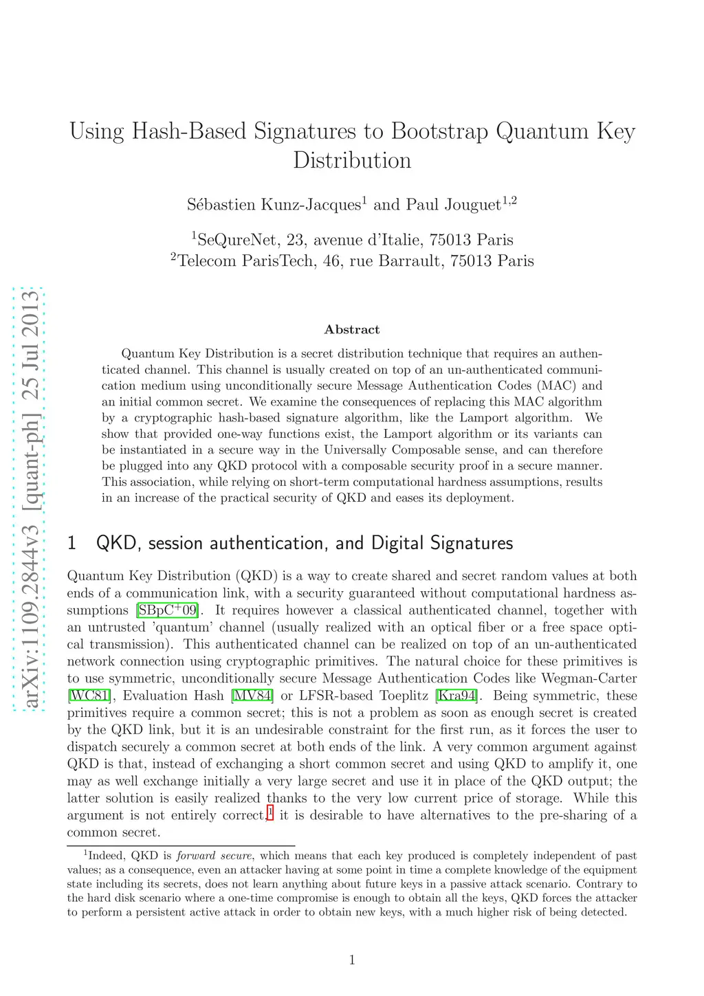 Quantum Key Distribution is a secret distribution technique that requires an authenticated channel. This channel is usually created on top of an un-authenticated communication medium using unconditionally secure Message Authentication Codes (MAC) and an initial common secret. We examine the consequences of replacing this MAC algorithm by a cryptographic hash-based signature algorithm, like the Lamport algorithm. We show that provided one-way functions exist, the Lamport algorithm or its variants can be instantiated in a secure way in the Universally Composable sense, and can therefore be plugged into any QKD protocol with a composable security proof in a secure manner. This association, while relying on short-term computational hardness assumptions, results in an increase of the practical security of QKD and eases its deployment.