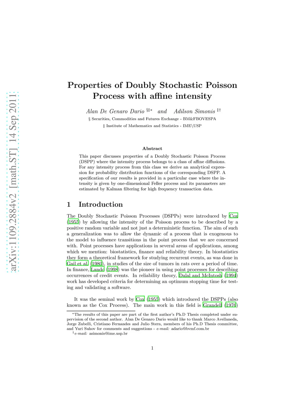 This paper discusses properties of a Doubly Stochastic Poisson Process (DSPP) where the intensity process belongs to a class of affine diffusions. For any intensity process from this class we derive an analytical expression for probability distribution functions of the corresponding DSPP. A specification of our results is provided in a particular case where the intensity is given by one-dimensional Feller process and its parameters are estimated by Kalman filtering for high frequency transaction data.