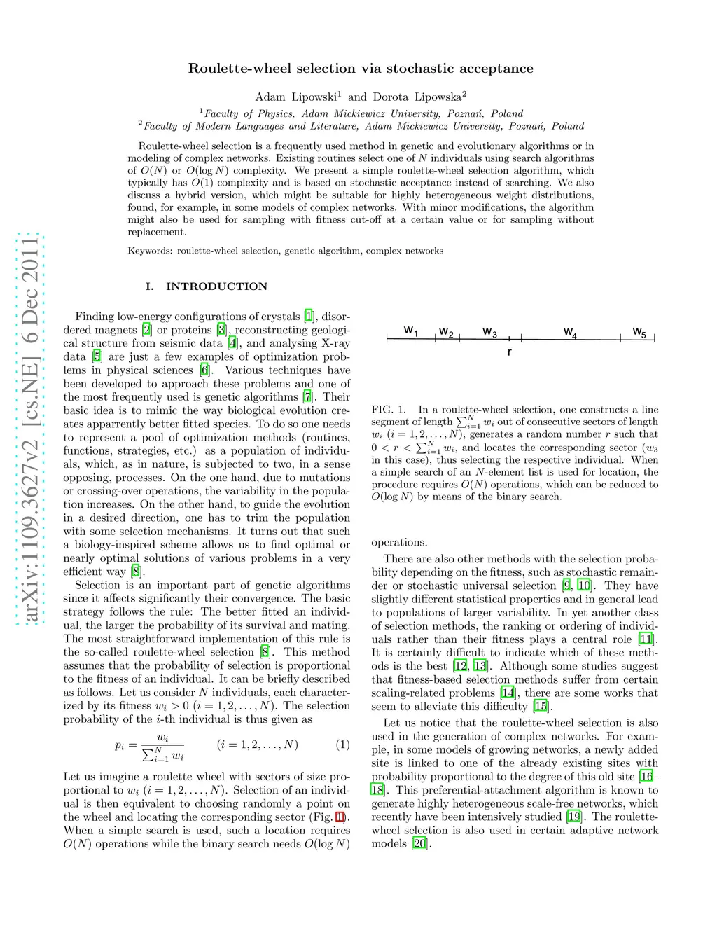Roulette-wheel selection is a frequently used method in genetic and evolutionary algorithms or in modeling of complex networks. Existing routines select one of N individuals using search algorithms of O(N) or O(log(N)) complexity. We present a simple roulette-wheel selection algorithm, which typically has O(1) complexity and is based on stochastic acceptance instead of searching. We also discuss a hybrid version, which might be suitable for highly heterogeneous weight distributions, found, for example, in some models of complex networks. With minor modifications, the algorithm might also be used for sampling with fitness cut-off at a certain value or for sampling without replacement.