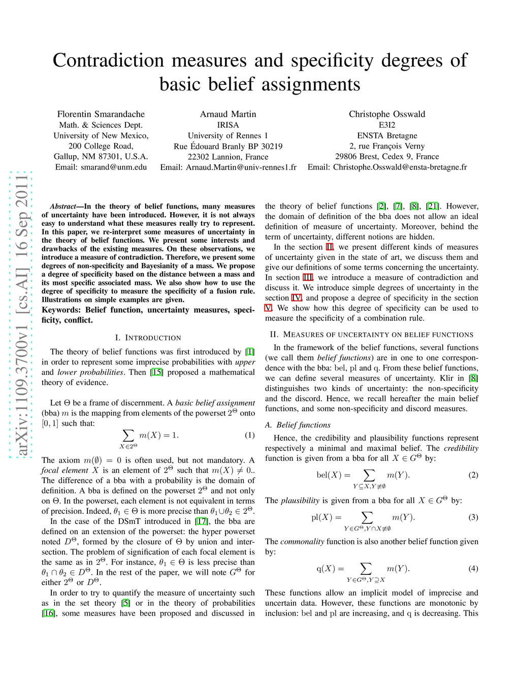 Contradiction measures and specificity degrees of basic belief